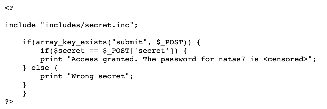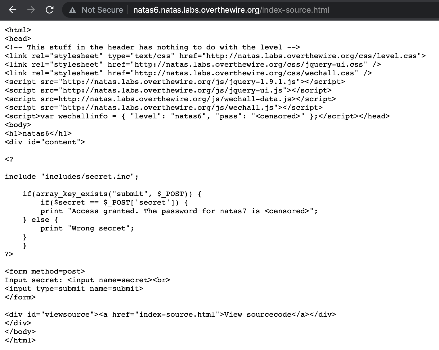 If we click View Sourcecode, we are taken do a different URL (http://natas6.natas.labs.overthewire.org/index-source.html). The source looks like: