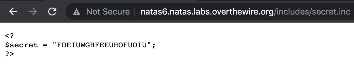 Head to http://natas6.natas.labs.overthewire.org/ and login with username natas6 and the password shown in level 5. The webpage looks like this: