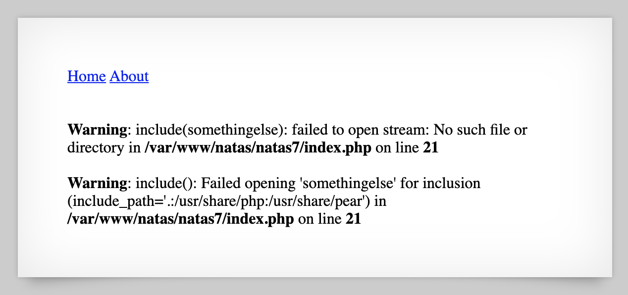 If replace <value> with something made-up (such as http://natas7.natas.labs.overthewire.org/index.php?page=somethingelse), we get an error message: