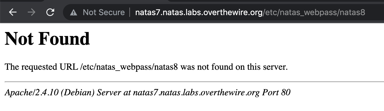 If we were to try to visit /etc/natas_webpass/natas8 directly (like we did with the secrets file in the previous level), we get a Not Found response: