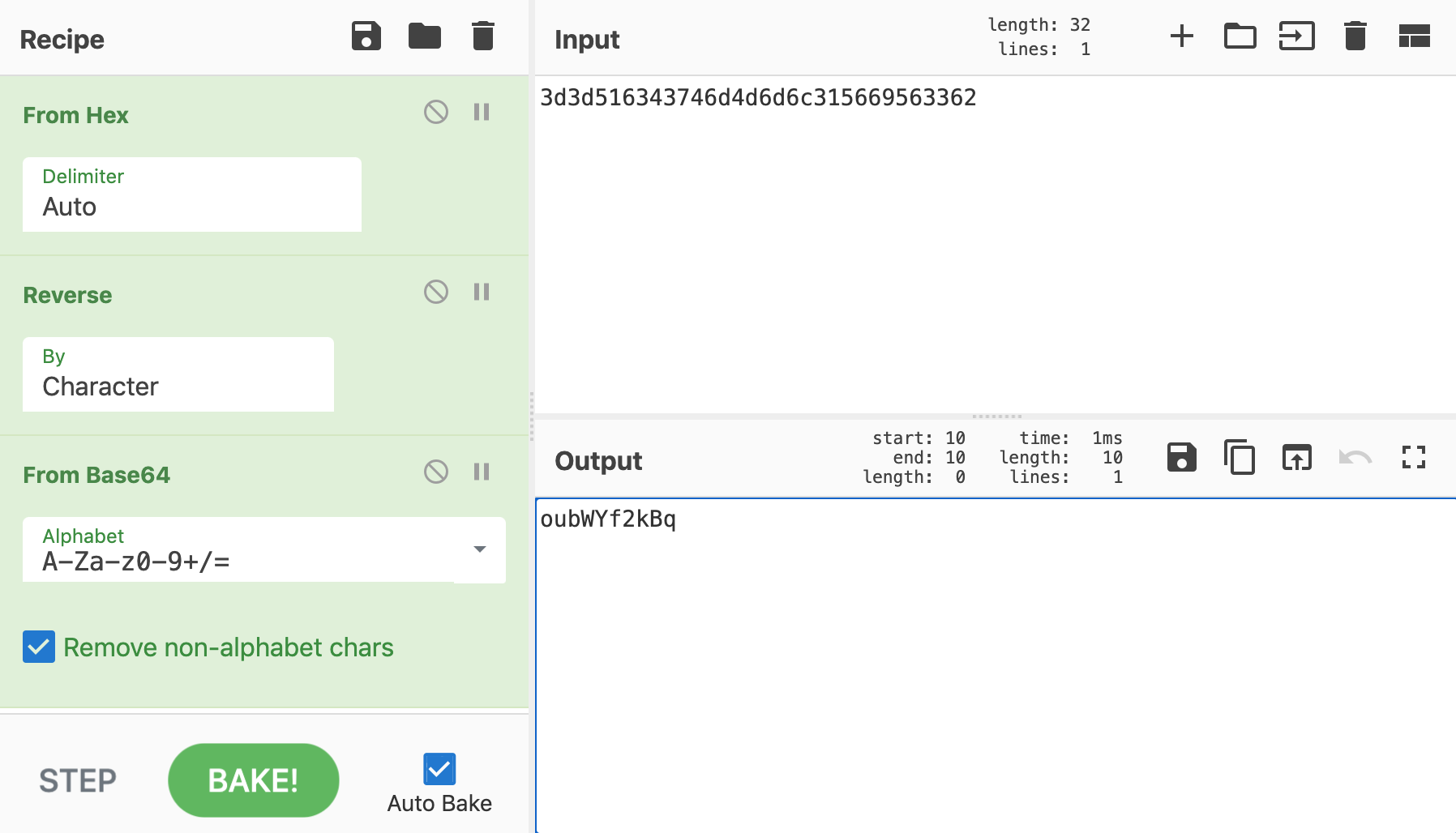 But this doesn’t actually have to be PHP-specific. We can use a tool like CyberChef to abstract the steps we identified away from the actual PHP implementation of those functions. Here’s a link to the CyberChef “recipe” shown below.