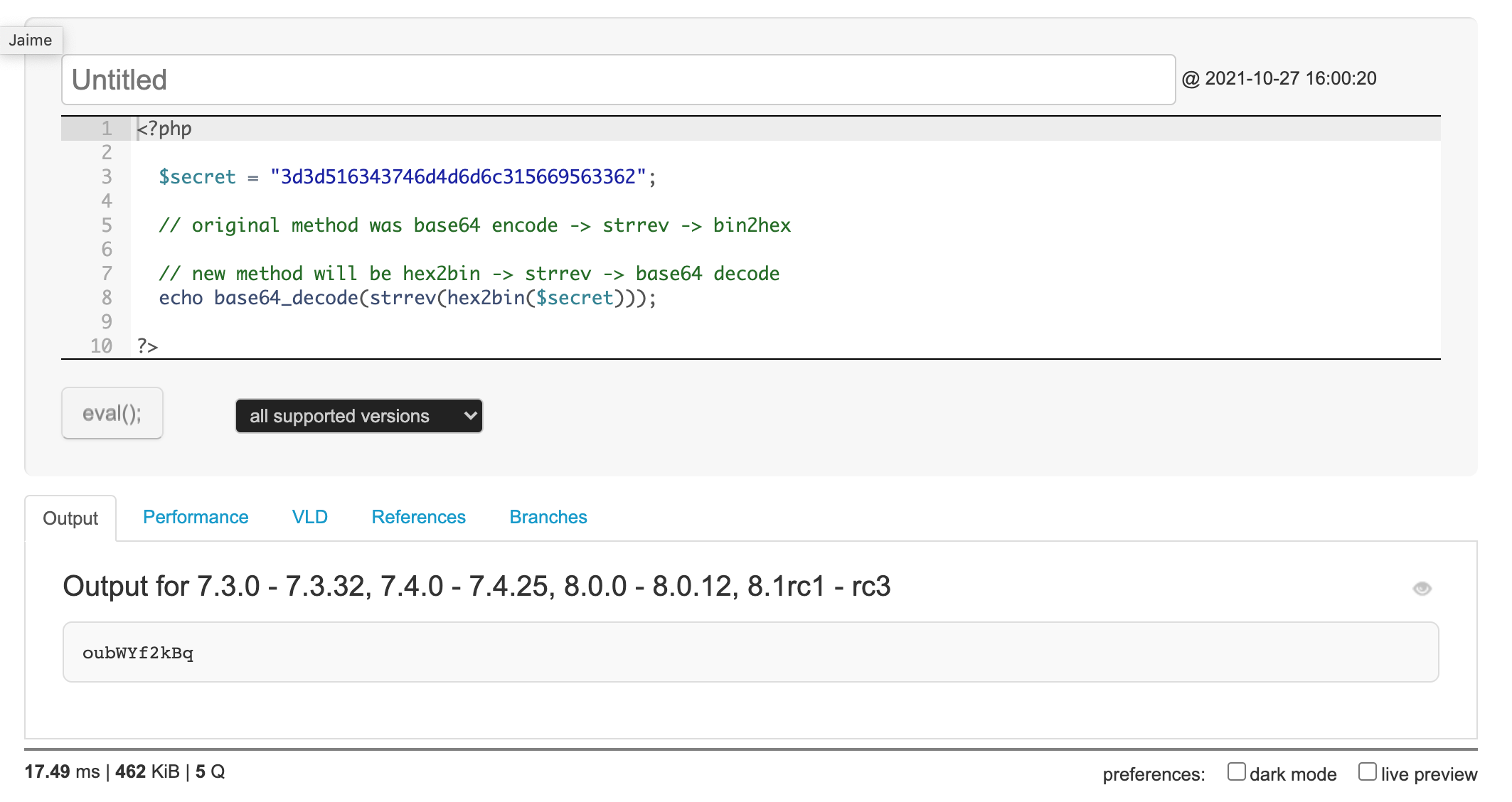 If that’s a string gets encoded, we need to do the opposite to decode it by doing hex2bin(), then strrev(), then base64_decode().
