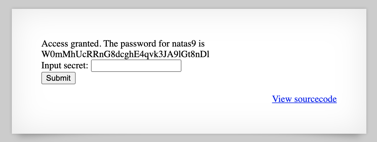 From there, it took a bit of guessing to figure out where the file was. I decided to try the pattern from level 8 and cat the contents of /etc/natas_webpass/natas9 using the input string ; cat /etc/natas_webpass/natas9;