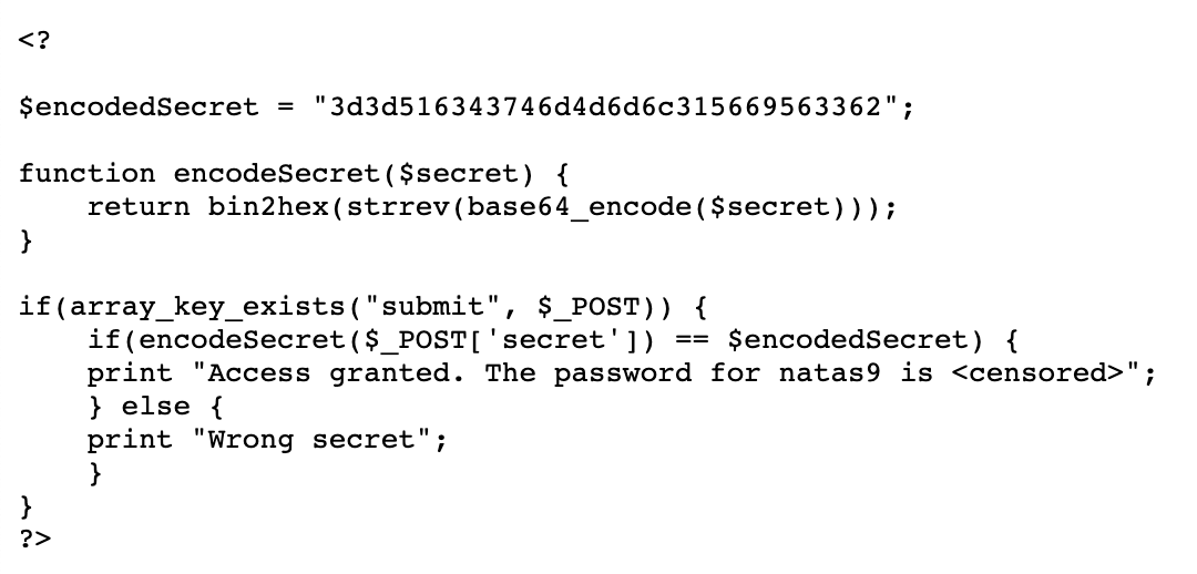 ?>Let’s dig into $encodedSecret next. Looks like they decided to no longer store their passwords in plaintext (smart!). We can still figure the password out though.