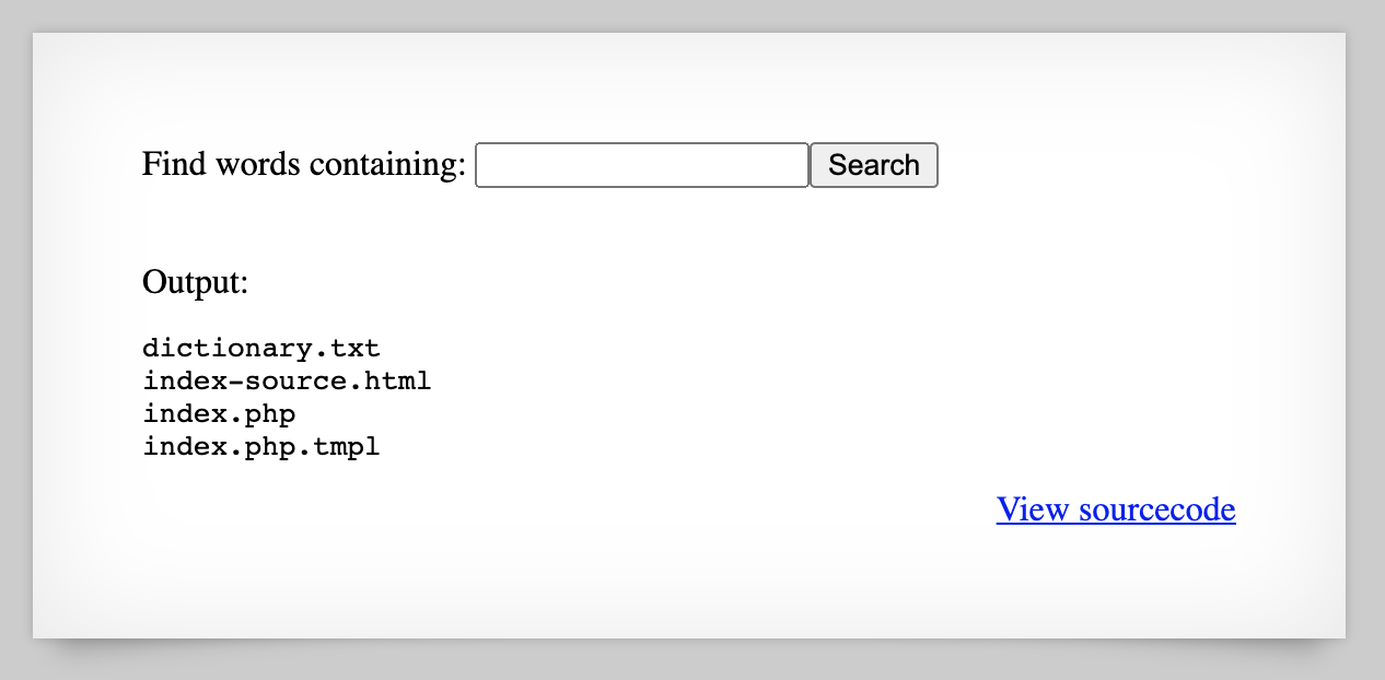 As it turns out, grep supports searching through a whole list of files, and since we can enter in text and spaces, we can use command injection to put another file name ahead of dictionary.txt, like this: