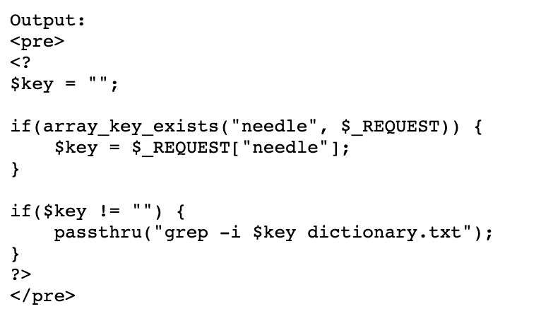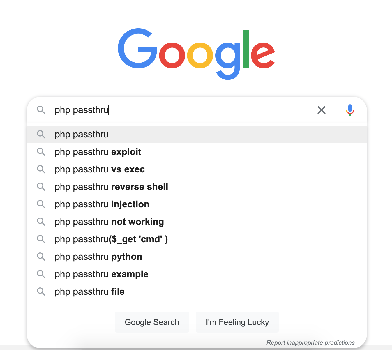 passthru("grep -i $key dictionary.txt");If we start a Google search for php passthru, we get some interesting suggestions: