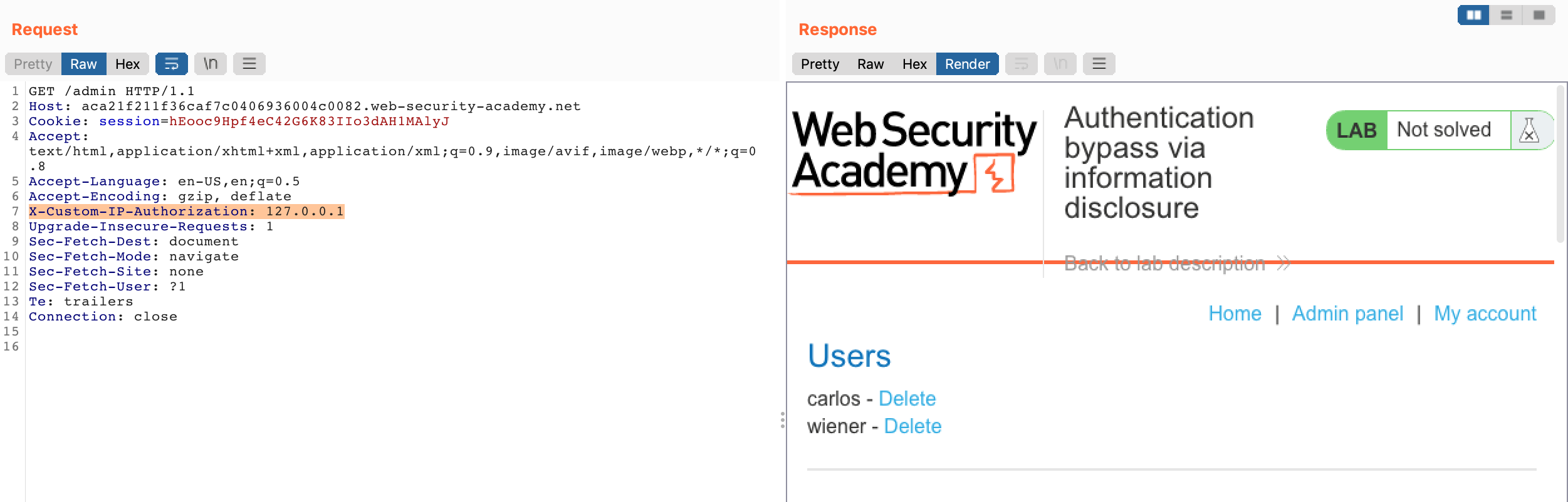 We see that this worked and tricked the webserver into thinking we’re accessing it locally. Burp Suite typically shows responses in plain HTML format by default, but the above screenshot was switched to the Render tab to make the response more obvious.