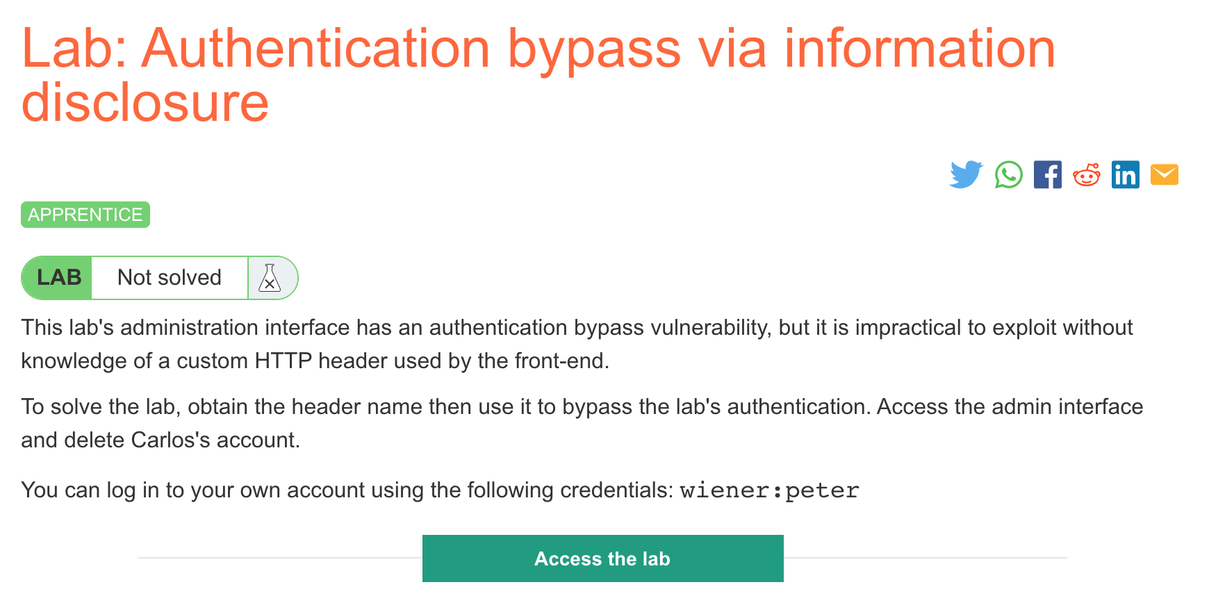 Before we get started, you’ll need a Portswigger Academy account. You’ll also need Burp Suite set up. Log in and then view the lab at https://portswigger.net/web-security/information-disclosure/exploiting/lab-infoleak-authentication-bypass. This is accessible from the “all labs” view.