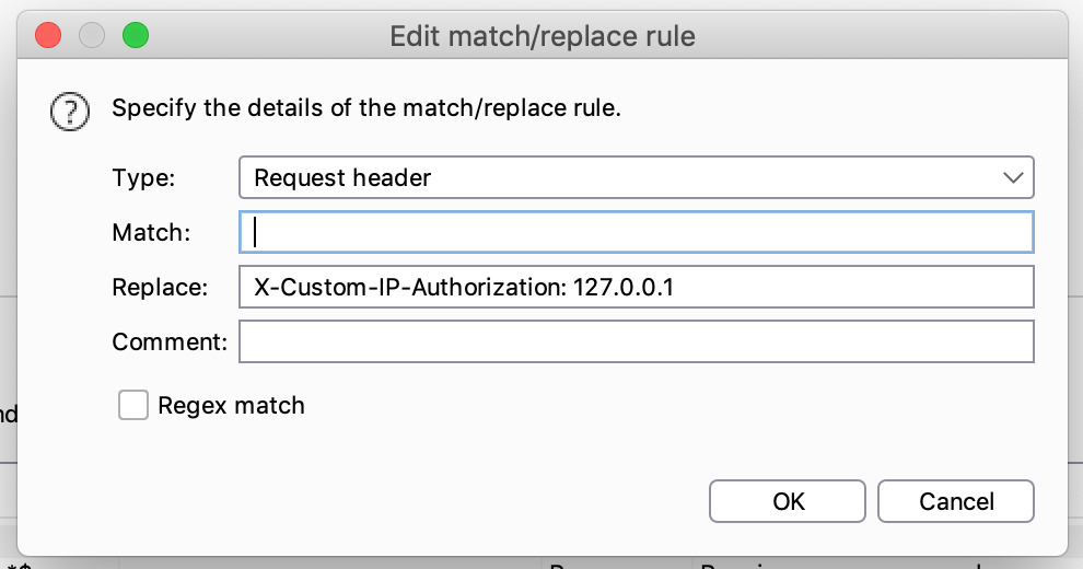 Click “Add” and then make a new rule for a Request Header with “Replace” value X-Custom-IP-Authorization: 127.0.0.1. You can leave the “Match” value empty, as this is a missing header that we will always have to add in, rather than a header that already exists and needs changing: