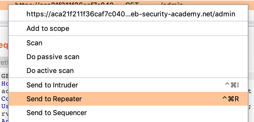 Then in Burp Suite’s Proxy > HTTP History view, right-click the request and Send to Repeater: