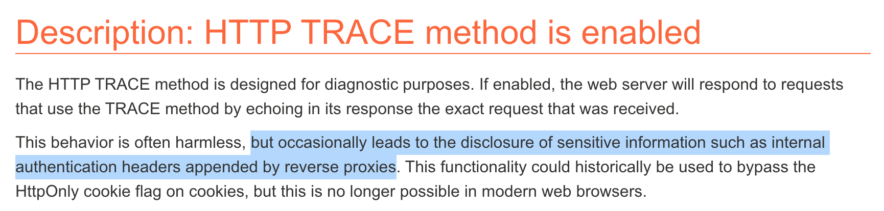 One of the information disclosure types documented on PortSwigger’s website is the HTTP TRACE method. This description, with the highlighted part in particular, seems to describe our situation: