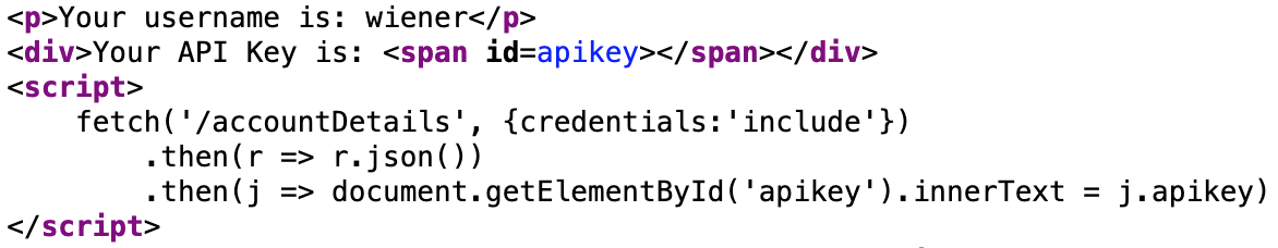 };This attack code is simpler than the “null origin” CORS attack, which loaded things in an iframe. This is just plain Javascript, so it will need to be stuck inside a set of <script> tags.