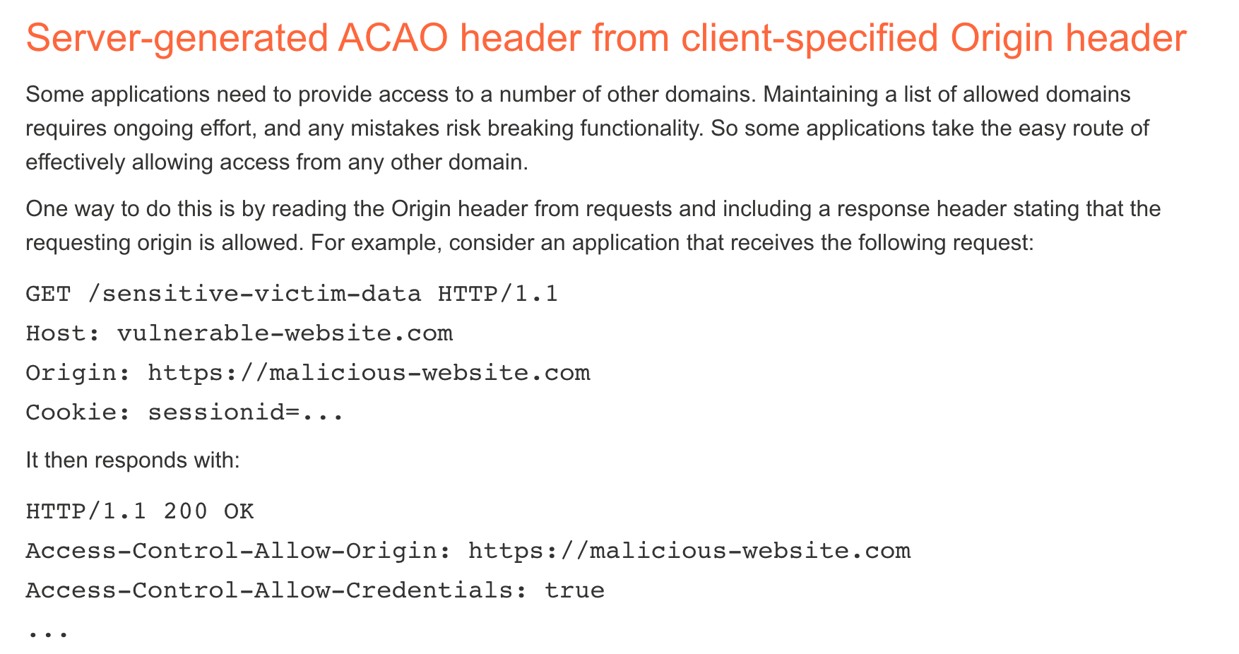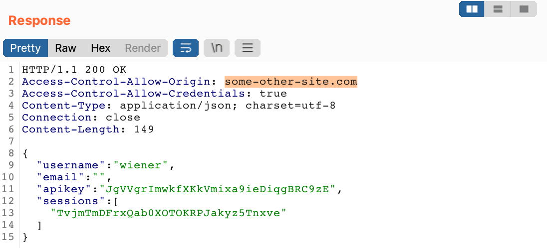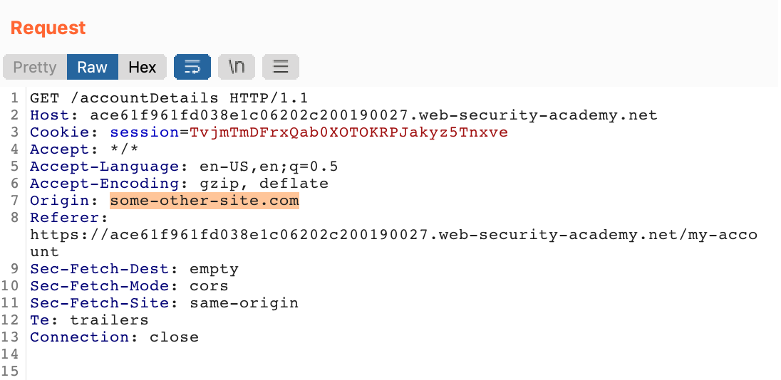 If our lab server reflects the Origin value into the Access-Control-Allow-Origin header, then we won’t need to do anything extra for our attack (in terms of additional HTTP headers).