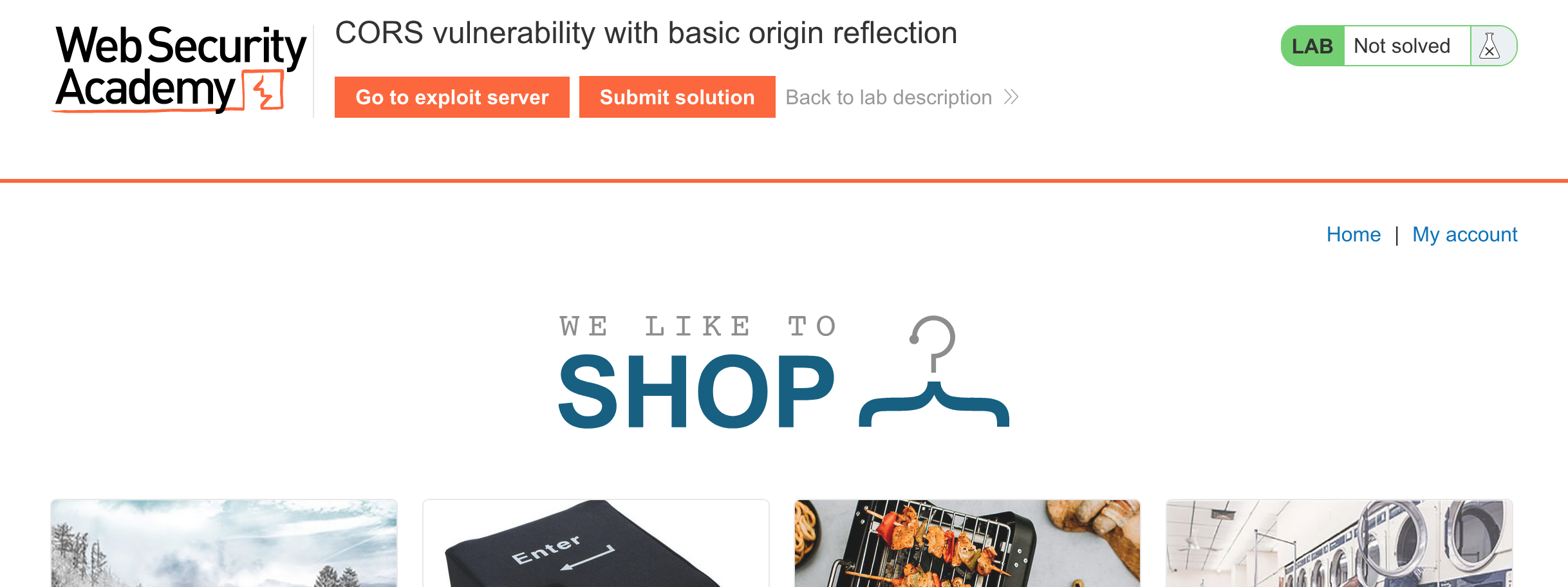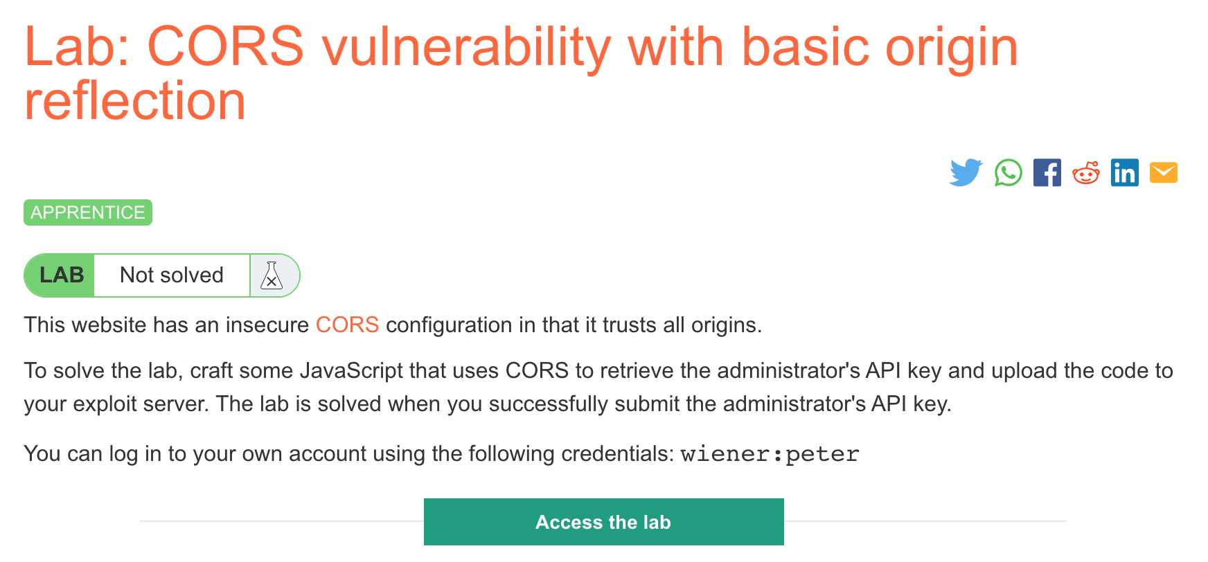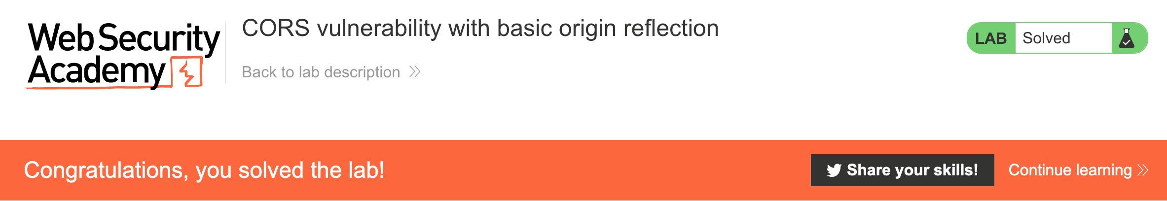 Log in to your Academy account and then view the lab at https://portswigger.net/web-security/cors/lab-basic-origin-reflection-attack. This is accessible from the “all labs” view or from the CORS page.