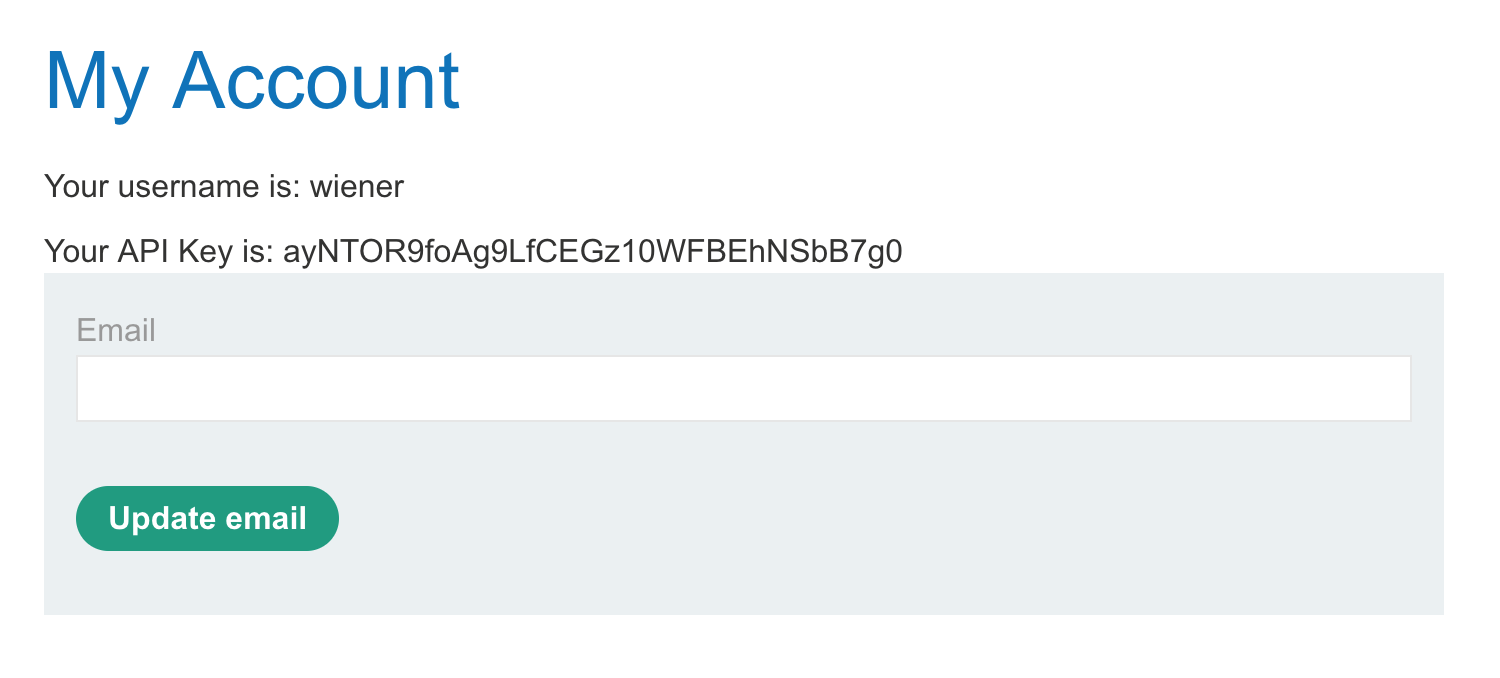 If we log in to our account (“My account”) with provided credentials wiener:peter, the account page looks like this: