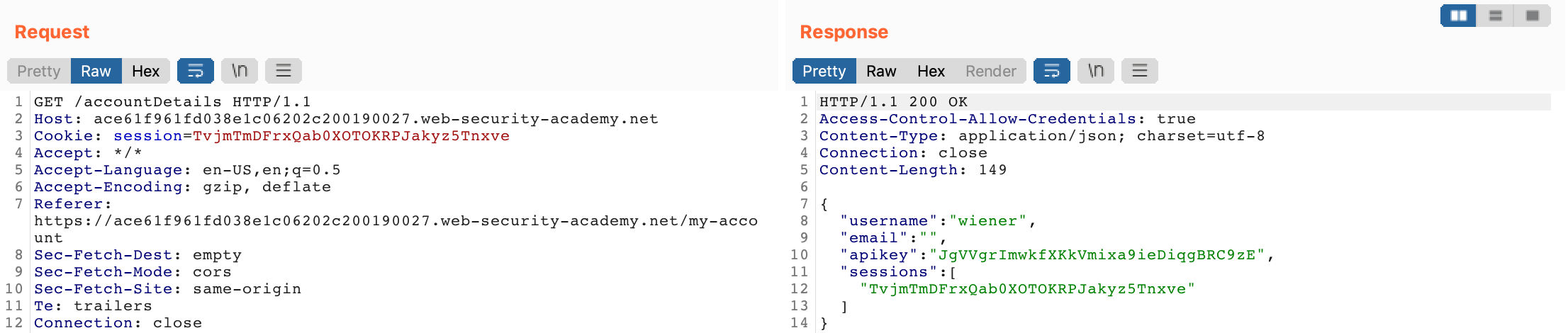 Let’s test this theory out by using Burp Suite to intercept the /accountDetails request made earlier, when we loaded account details for user wiener. Here’s the original request: