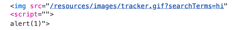 We were able to inject our input into the page, via the document.write() call that creates the img tag, but it’s still not quite right. The coloring in this screenshot gives us a hint that there’s a syntax error, and the script tag isn’t being recognized as it’s own element, but instead, something weirdly tacked onto the end of the <img> tag.