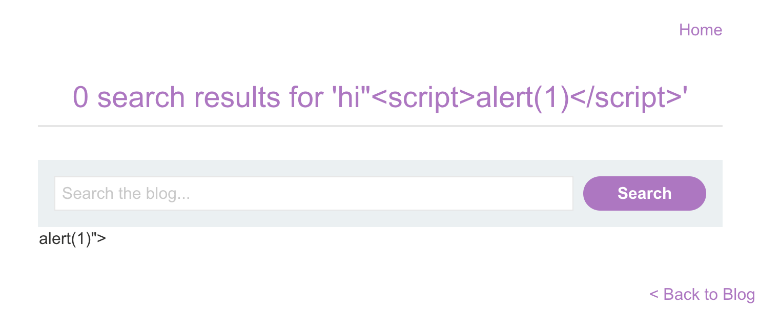 If we add a closing > before we begin our malicious script tag, the search payload looks like this: