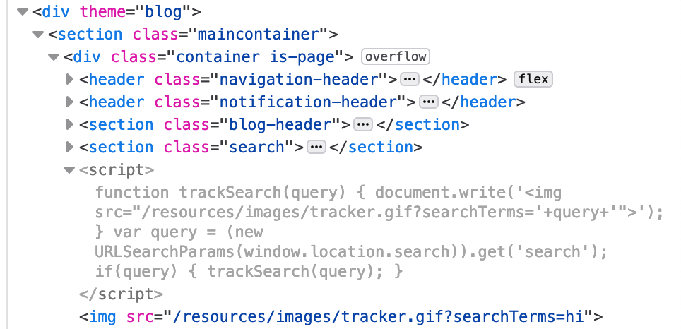 If we input “hi” as our search parameter, then open up Dev Tools, we can see a <script> section with the following contents: