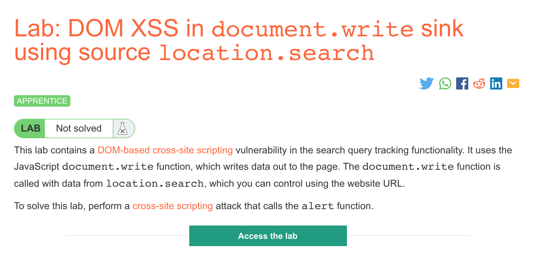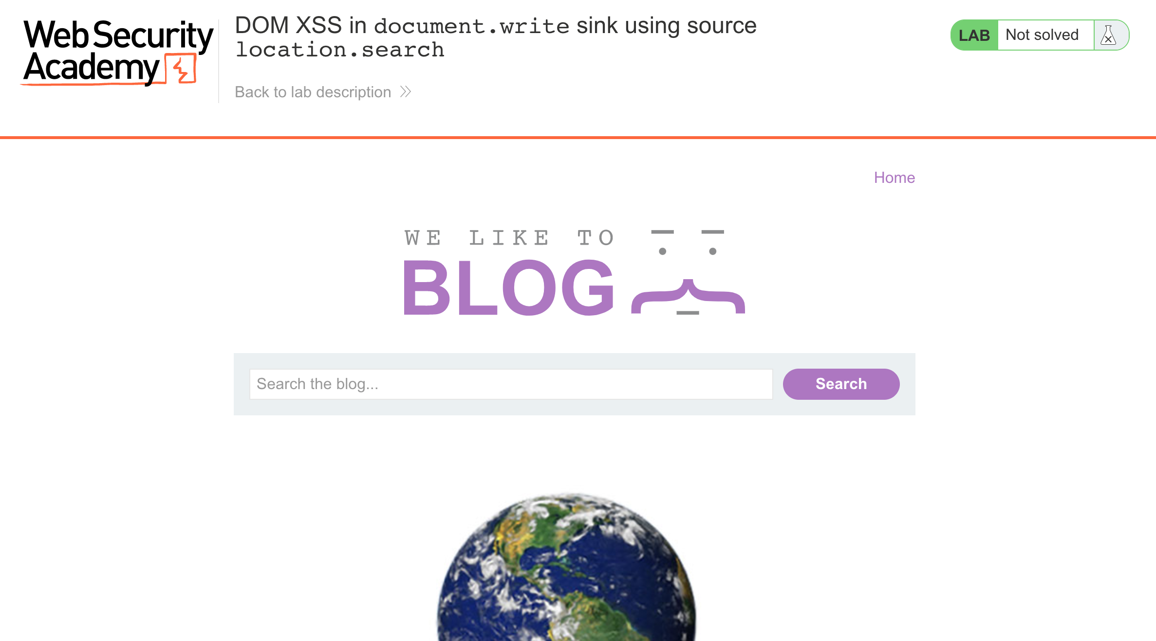 After logging in, head over to the lab, located at https://portswigger.net/web-security/cross-site-scripting/dom-based/lab-document-write-sink. You can find this through the Academy learning path list, or linked within the DOM-based XSS blog post.