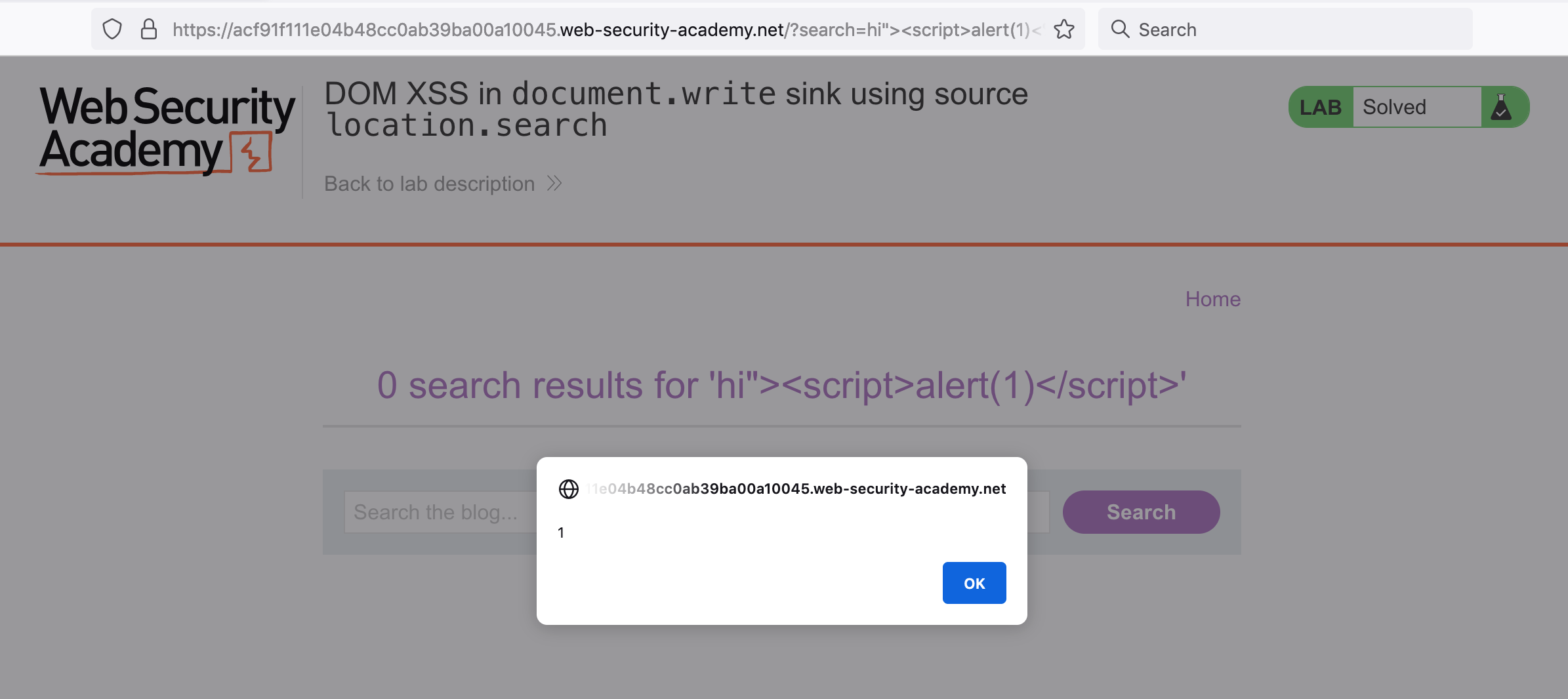PortSwigger's "DOM XSS in document.write sink using source location.search" Walkthrough