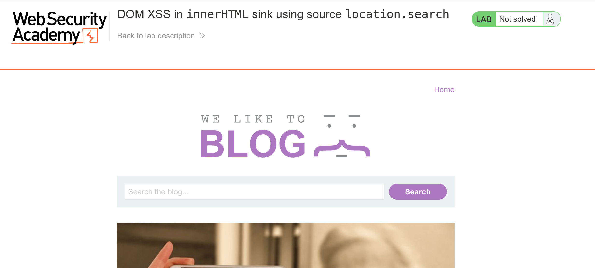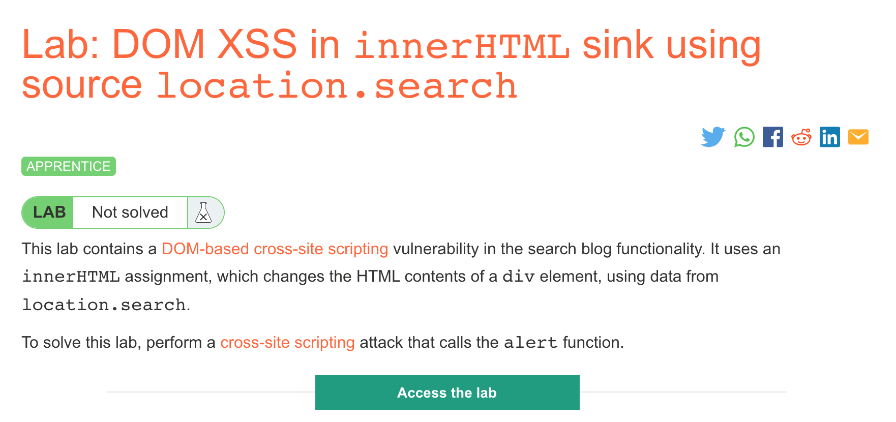 After logging in, head over to the lab, located at https://portswigger.net/web-security/cross-site-scripting/dom-based/lab-innerhtml-sink. You can find this through the Academy learning path list, or linked within the DOM-based XSS blog post.