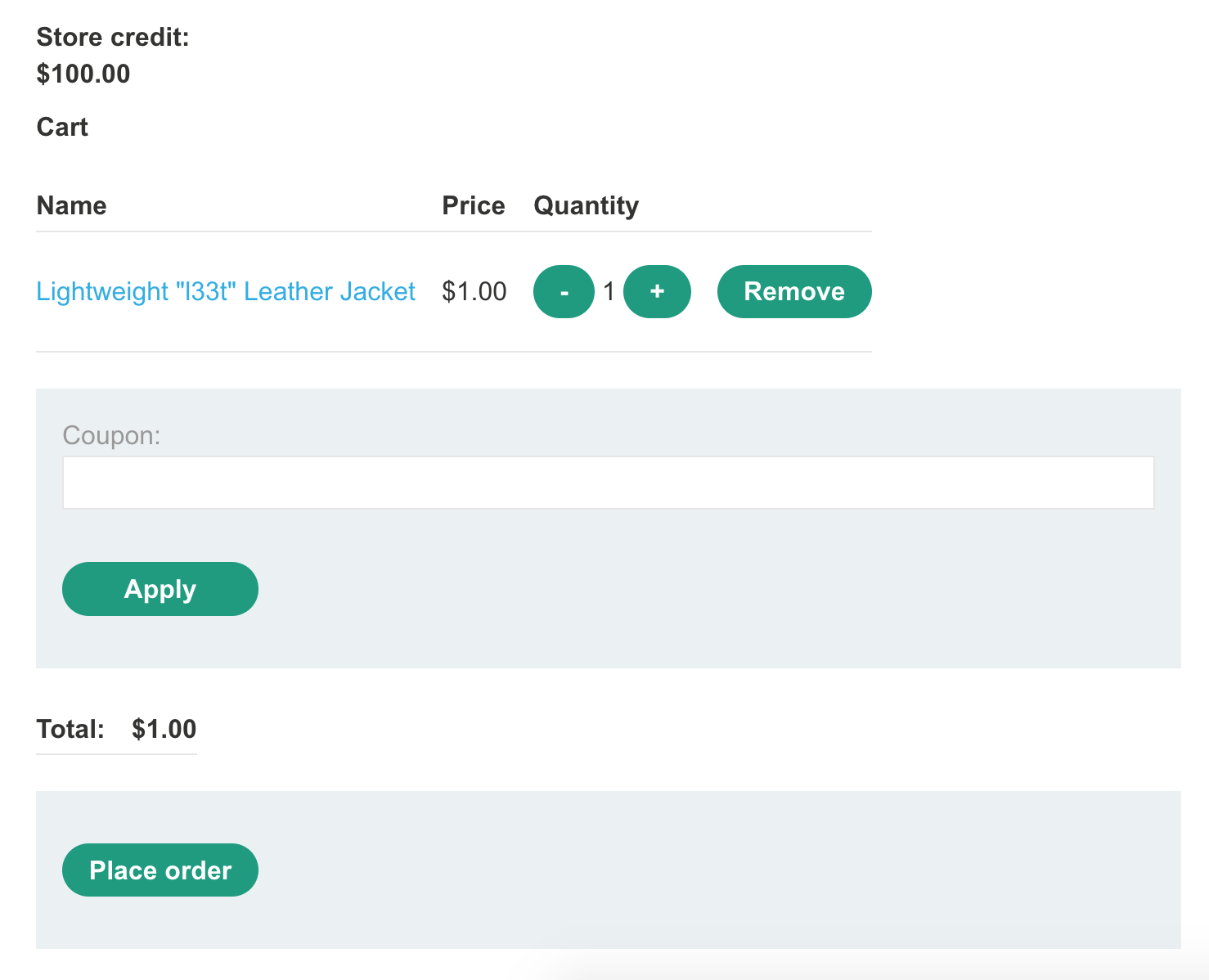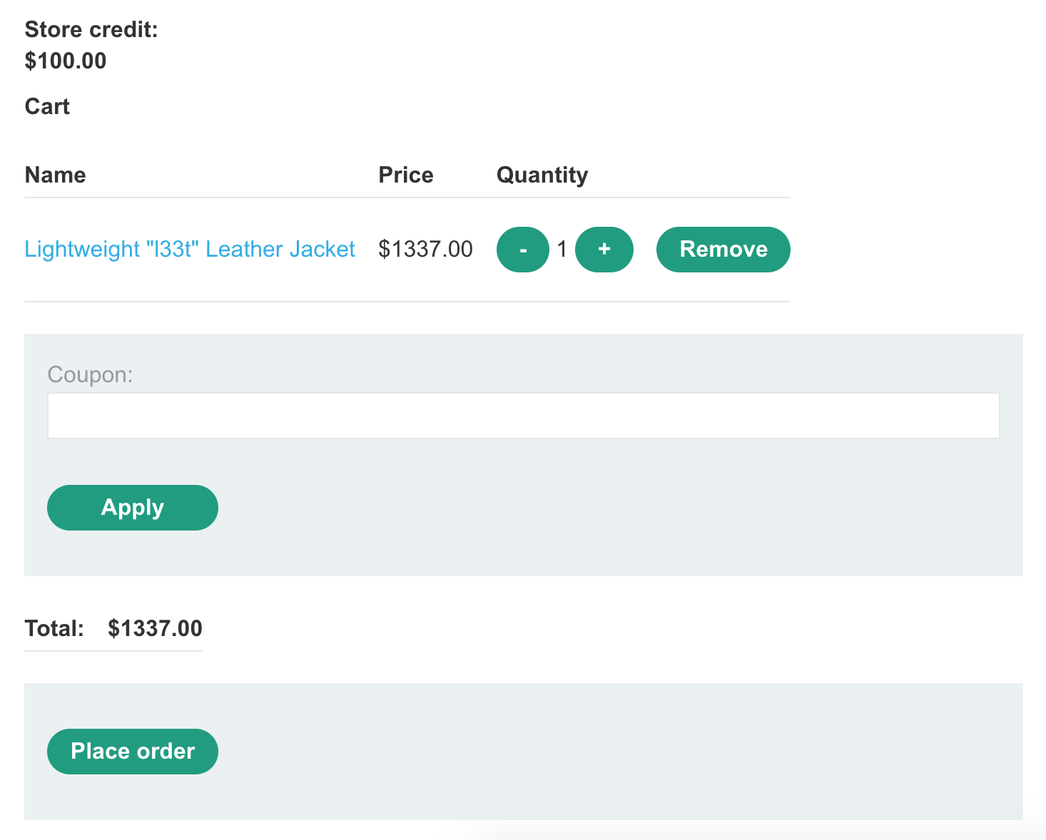 This is because we have $100 in store credits, and are trying to buy something worth $1337. Trying to modify the price on the cart page is not useful, as this information has already been sent from the server and we are not affecting any backend information.
