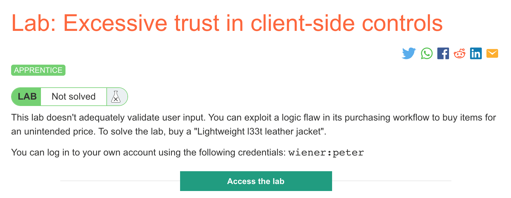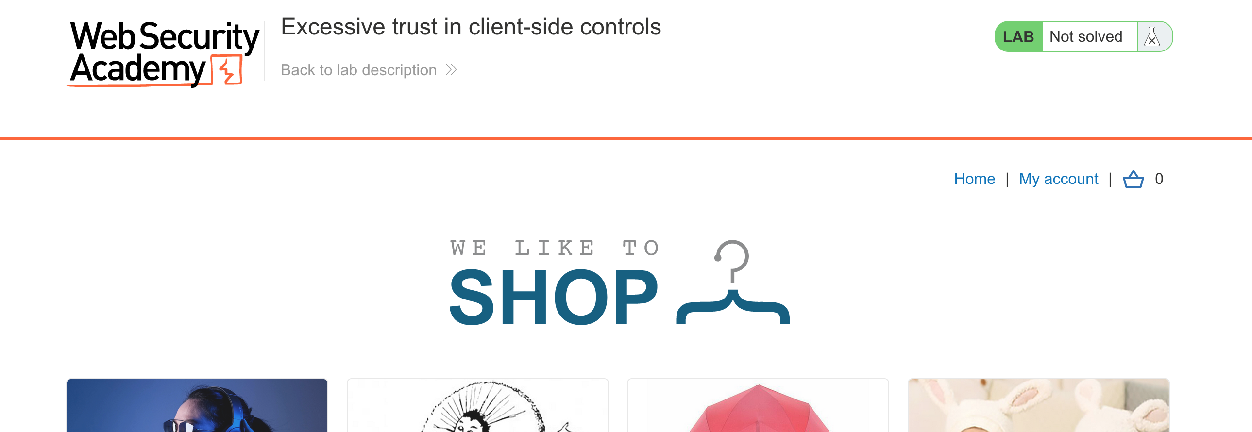 Log in to your Academy account and then view the lab at https://portswigger.net/web-security/logic-flaws/examples/lab-logic-flaws-excessive-trust-in-client-side-controls. This is accessible from the “all labs” view or from the Business Logic Flaws page.