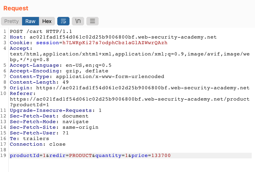 Remove any existing cart items. Then, go to Burp Suite’s Proxy > HTTP history page and find the add-product request. This is a POST request to /cart.