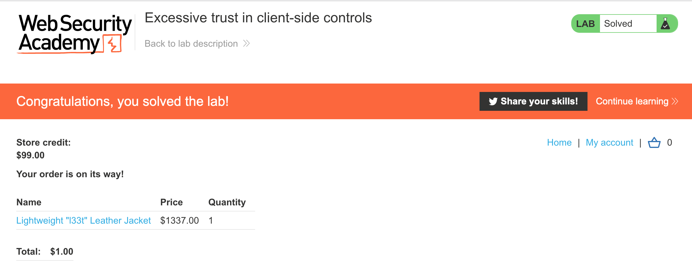 After you’ve placed the order, you should see that the lab is solved: