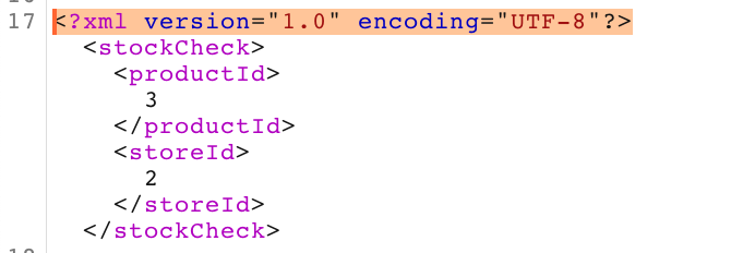 <stockCheck><productId>&xxe;</productId></stockCheck>If we compare this with the existing XML object, we already have the first <?xml> tag: