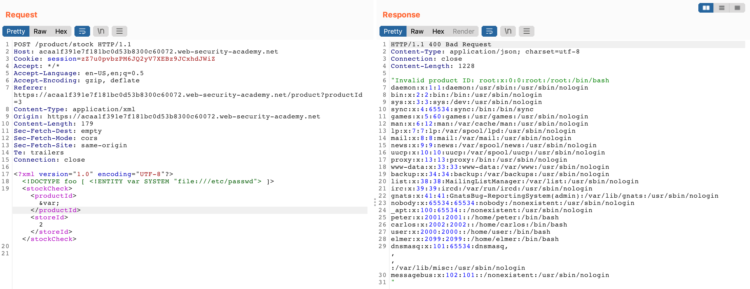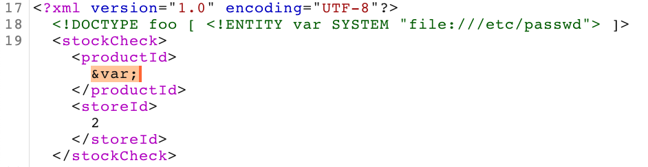 To do so, you can remove one of the numbers (such as the productId value) and replace it with a reference to the external entity, which I called var and the original example called xxe. Whatever you name it, add & to the front and ; to the end to make it act as a variable.