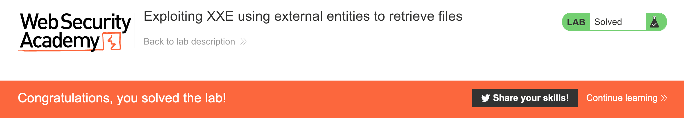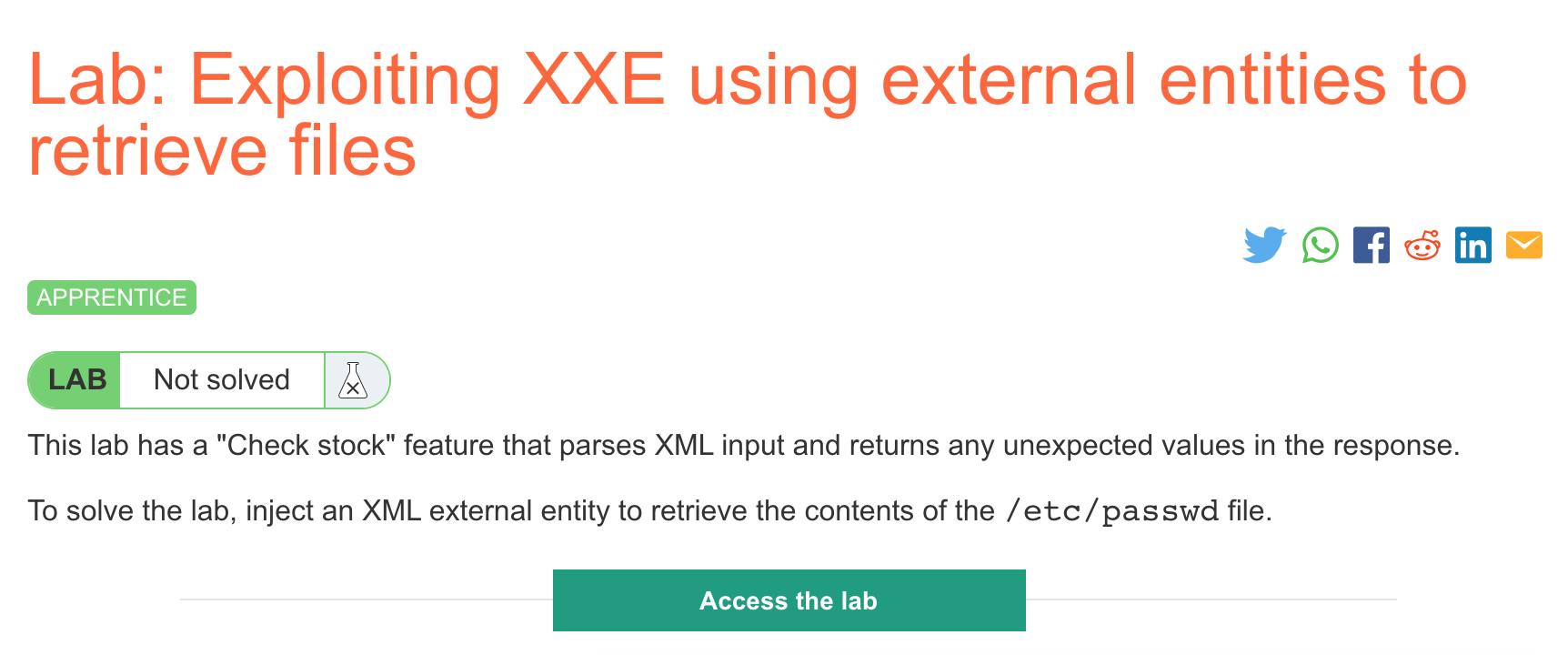 Log in to your Academy account and then view the lab at https://portswigger.net/web-security/xxe/lab-exploiting-xxe-to-retrieve-files. This is accessible from the “all labs” view or from the XXE page.