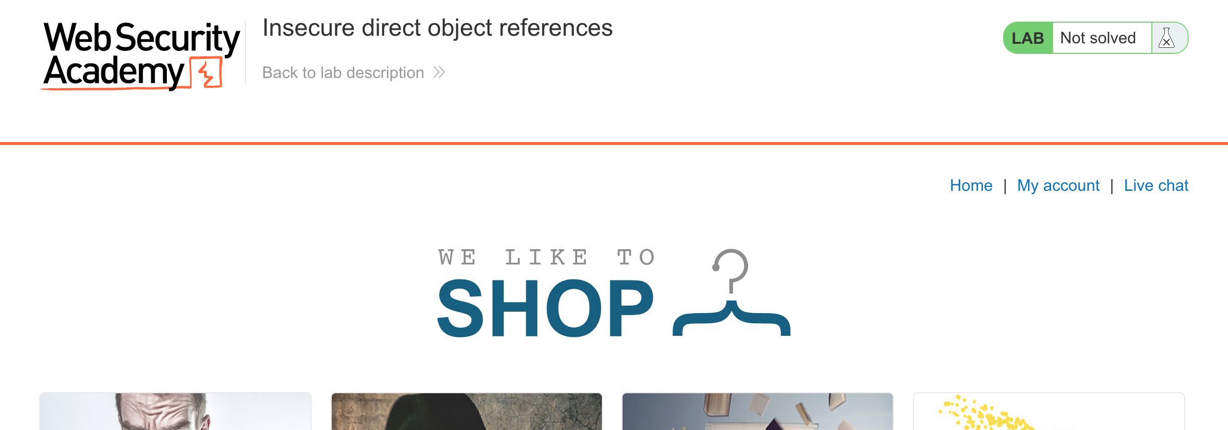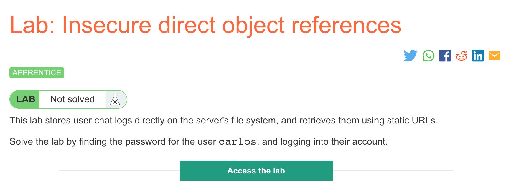 You’ll need Burp Suite set up, as well as a Portswigger Academy account. Log in to your account, then open up https://portswigger.net/web-security/access-control/lab-insecure-direct-object-references. You can find this from the “all labs” view or the IDOR blog post.