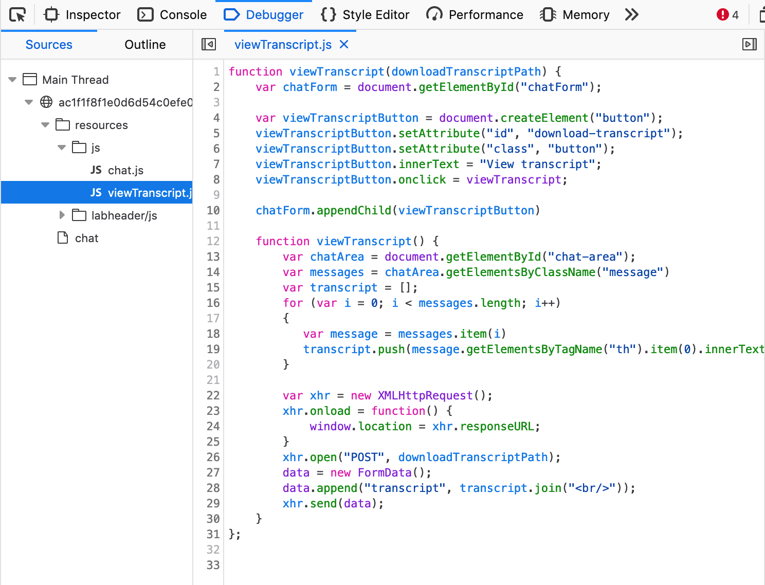 The file itself is nothing interesting (just the chat we already saw) but the name, 2.txt, is interesting. Let’s figure out where it came from. Using Dev Tools, we can look at the Javascript file responsible for this download: