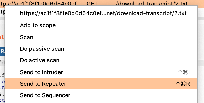 You should see GET /download-transcript/2.txt in your Proxy > HTTP History tab. Right click, and Send to Repeater.