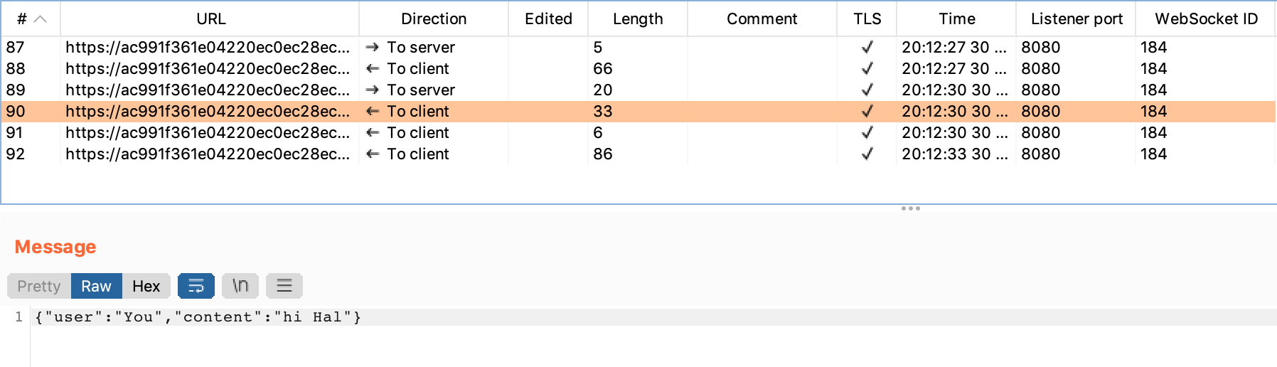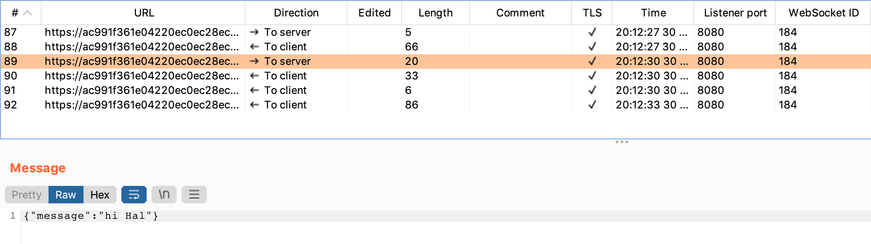 The next one is the “hi Hal” message shown earlier. This message is being sent to the server (from the client).