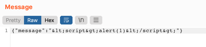 If we try to send a message from the browser with an XSS payload, we have a problem: the brackets are getting encoded.