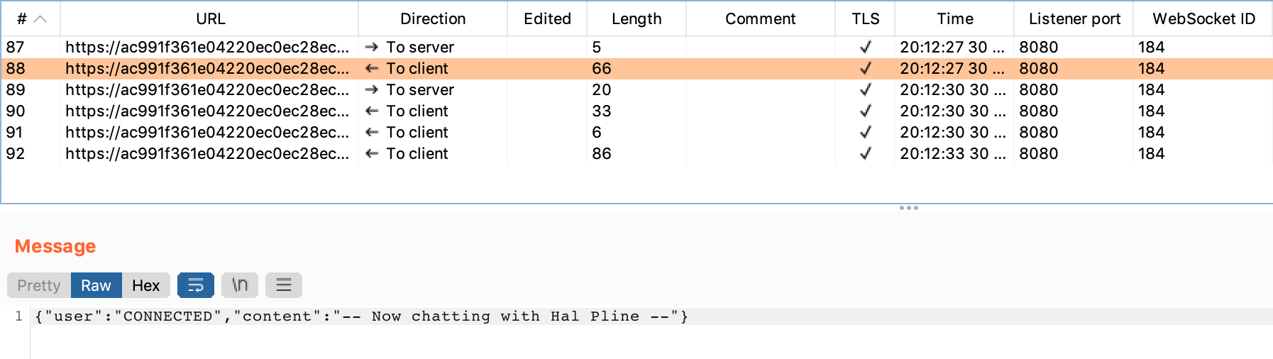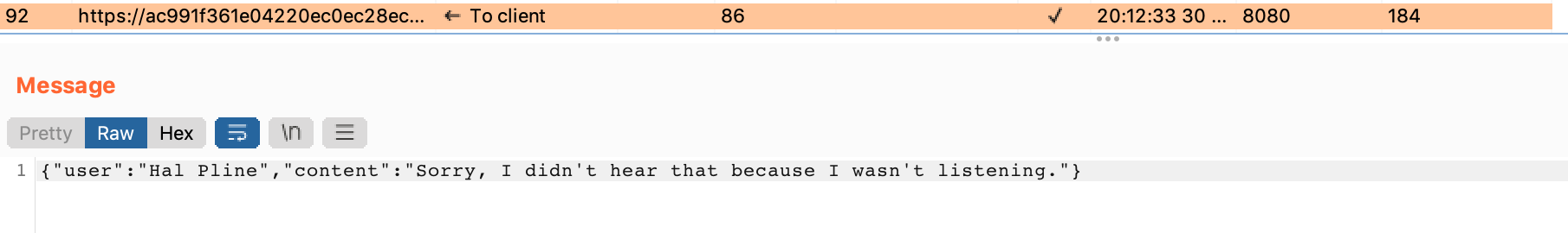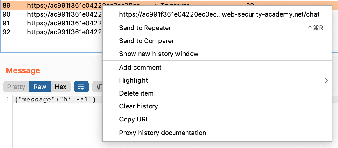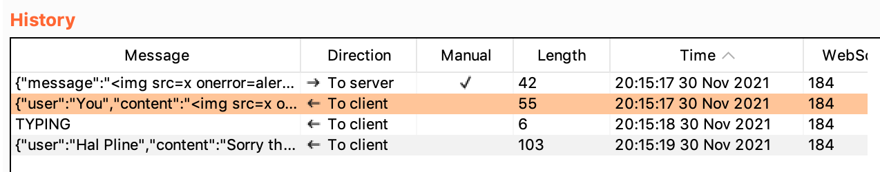 To circumvent this, we can select a chat message from our WebSockets history, then modify it in Burp Suite. But first, which message should we choose?