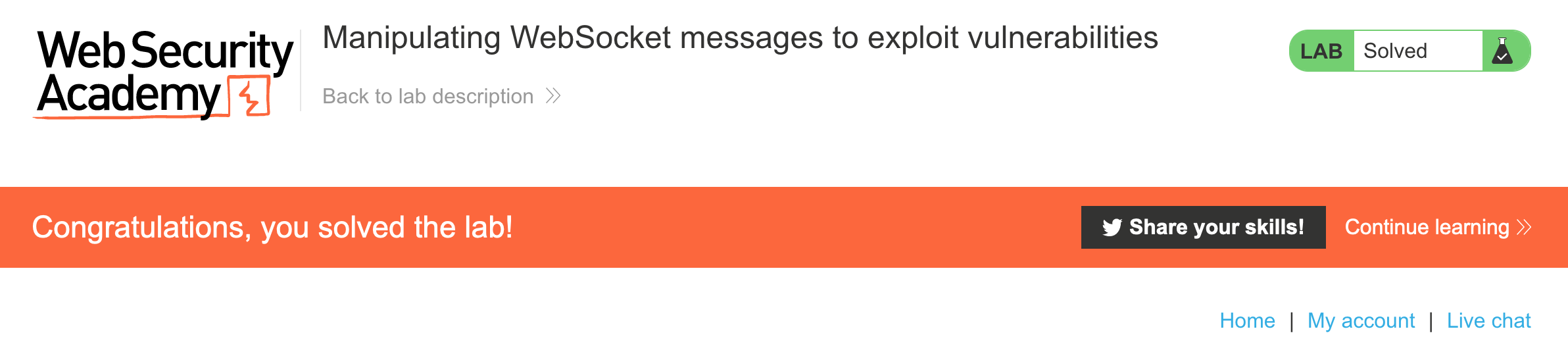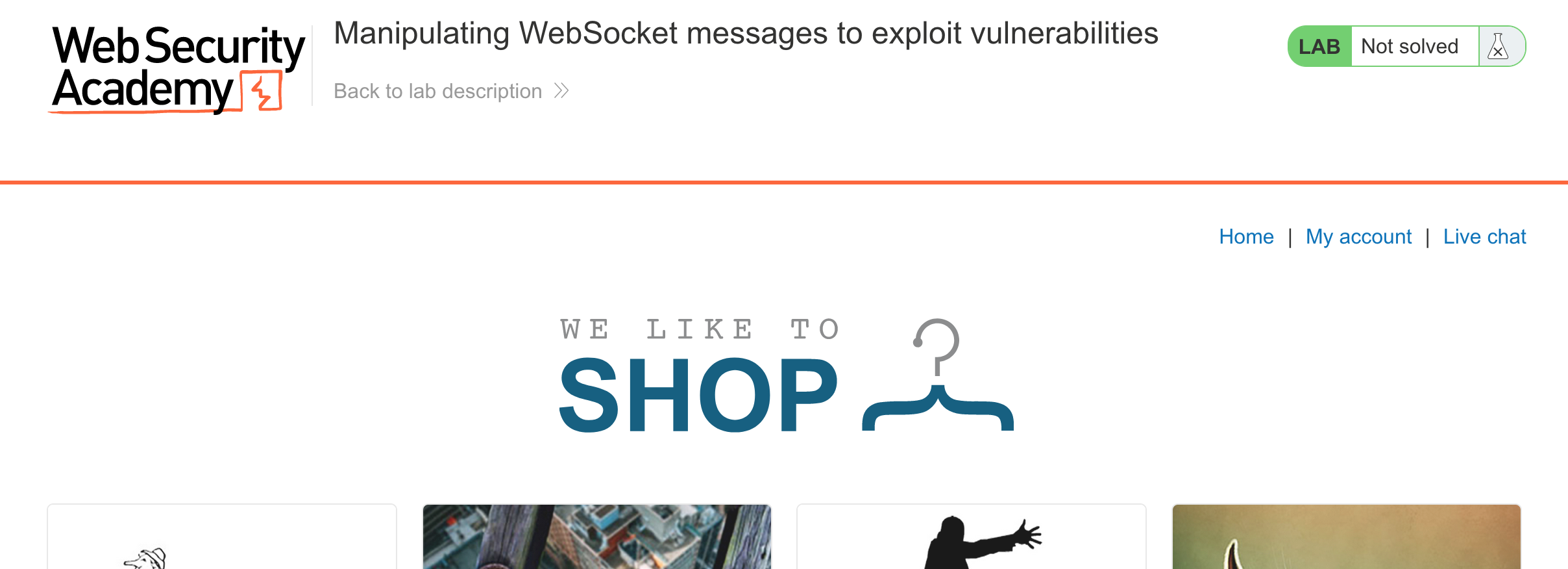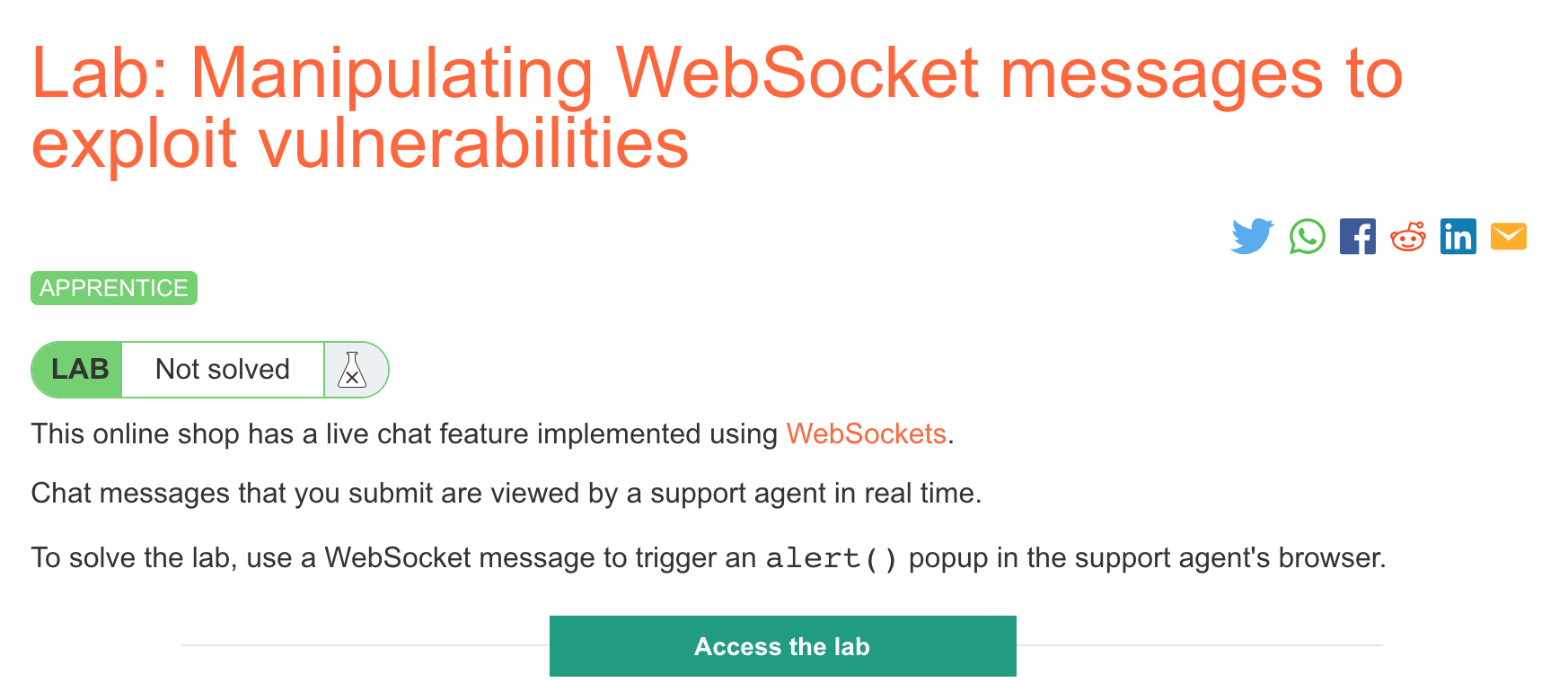 Log in to your Academy account and then view the lab at https://portswigger.net/web-security/websockets/lab-manipulating-messages-to-exploit-vulnerabilities. This is accessible from the “all labs” view or from the WebSockets page.