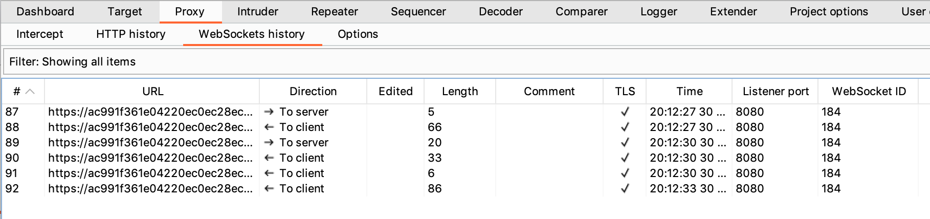 Proxy > HTTP history will show you the HTTP requests for various webpages, but we have to go elsewhere to view the chat traffic.