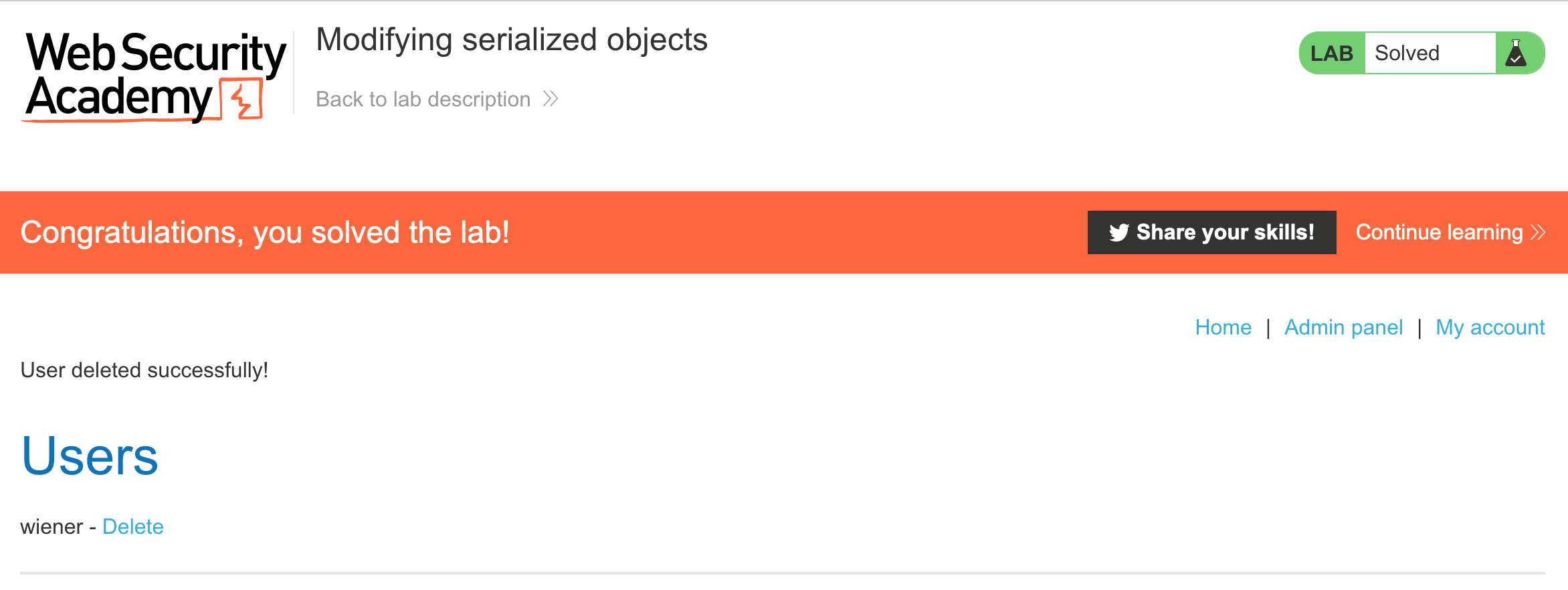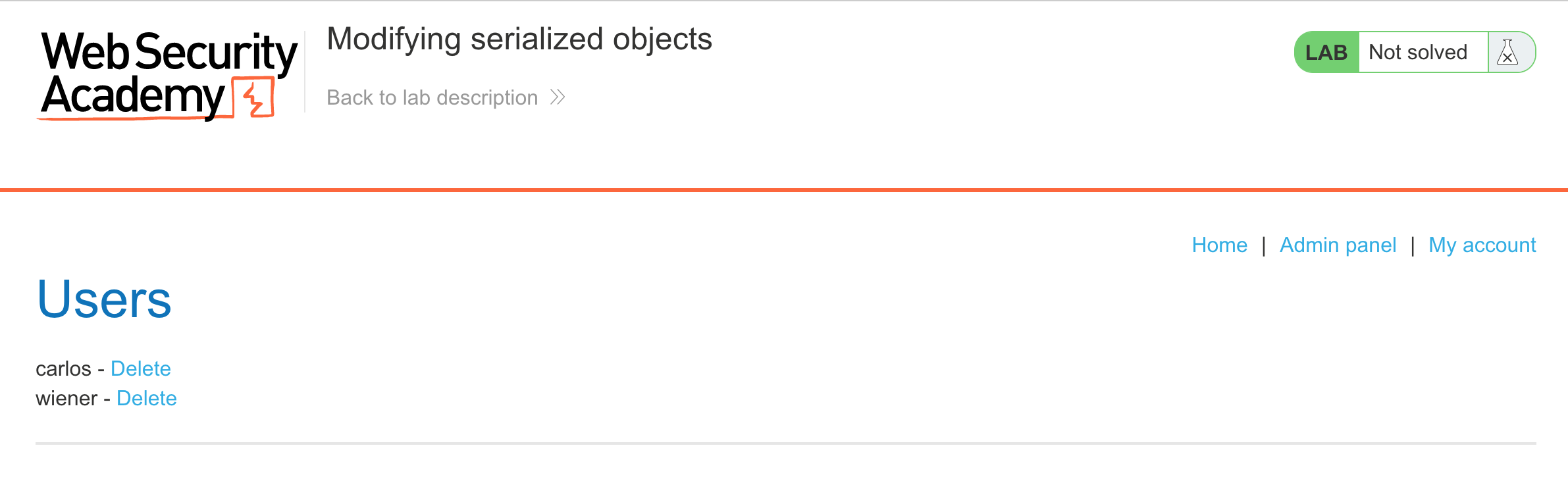 Then delete Carlos’ account and you’ll have solved the lab: