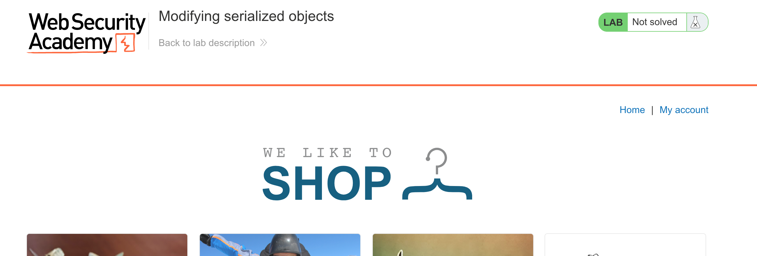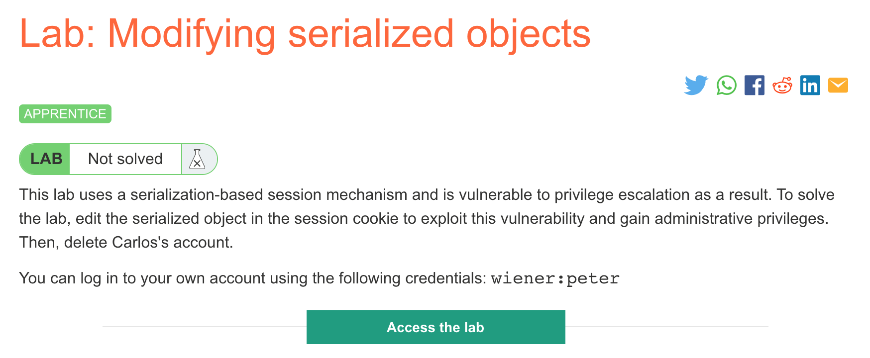 You won’t need Burp Suite for this challenge but you will need a Portswigger Academy account. Log in to your Academy account and then view the lab at https://portswigger.net/web-security/deserialization/exploiting/lab-deserialization-modifying-serialized-objects. This is accessible from the “all labs” view.