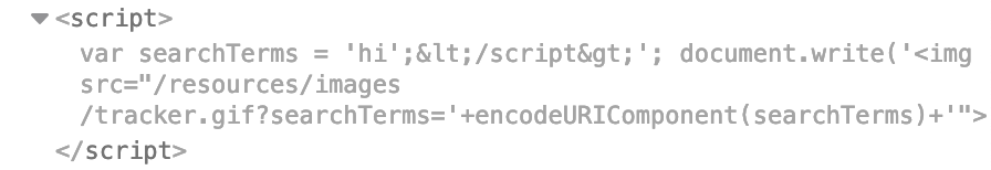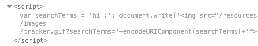 We see that there’s a <script> section that takes our input, assigns it to a searchTerms variable, then does a document.write with the URL encoded (using encodeURIComponent) value.