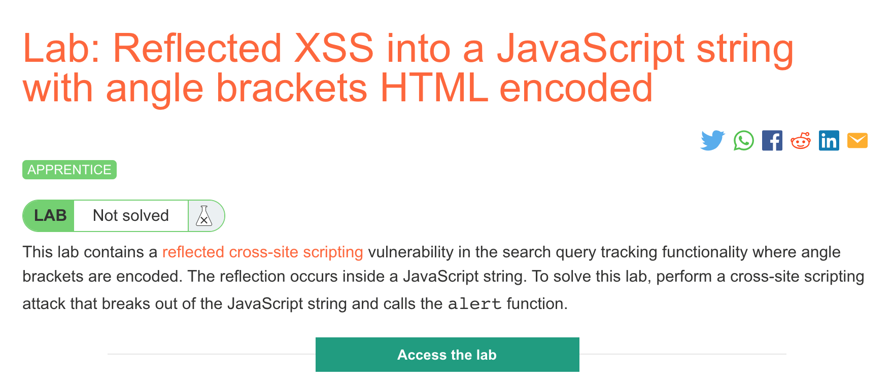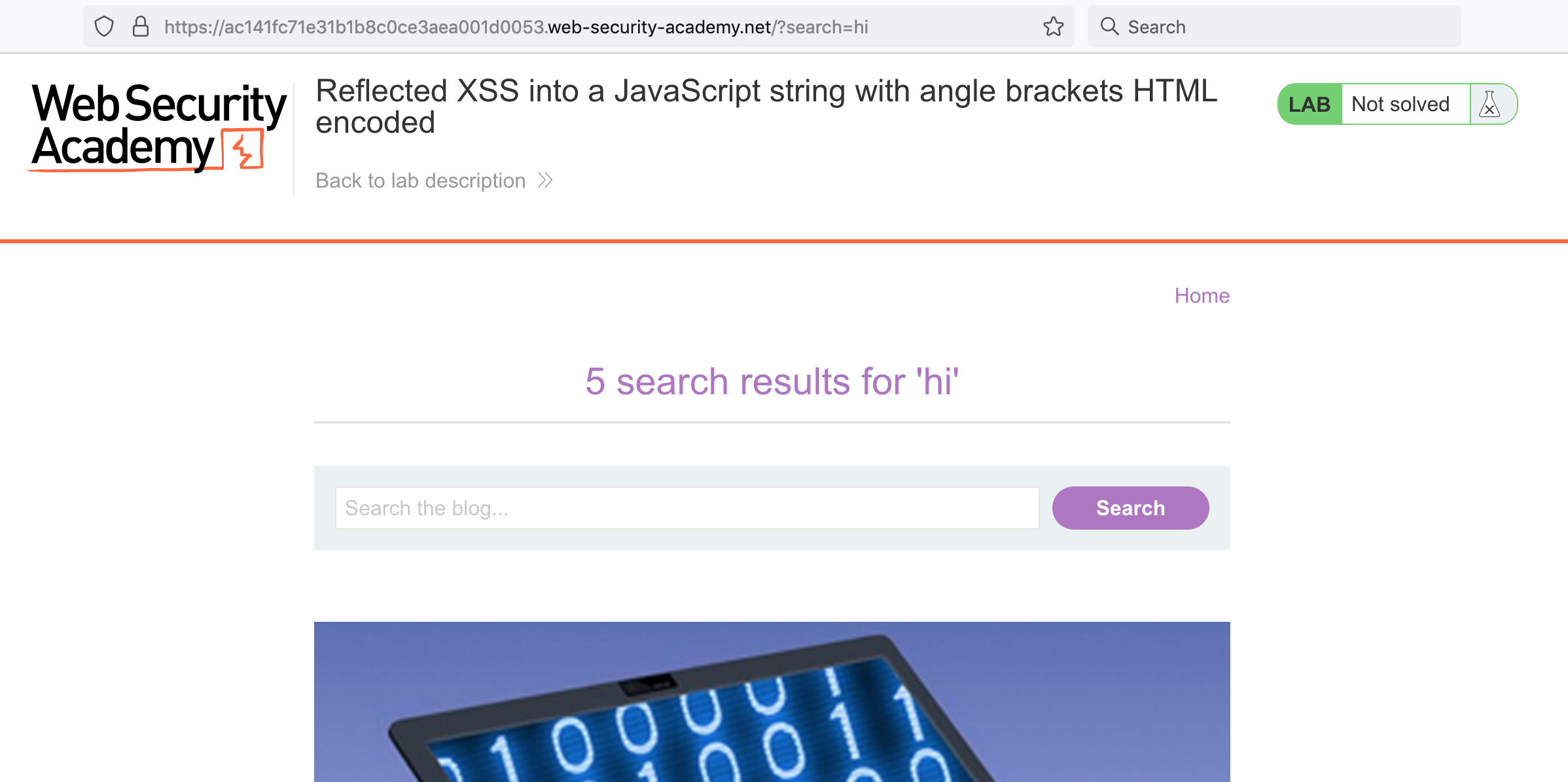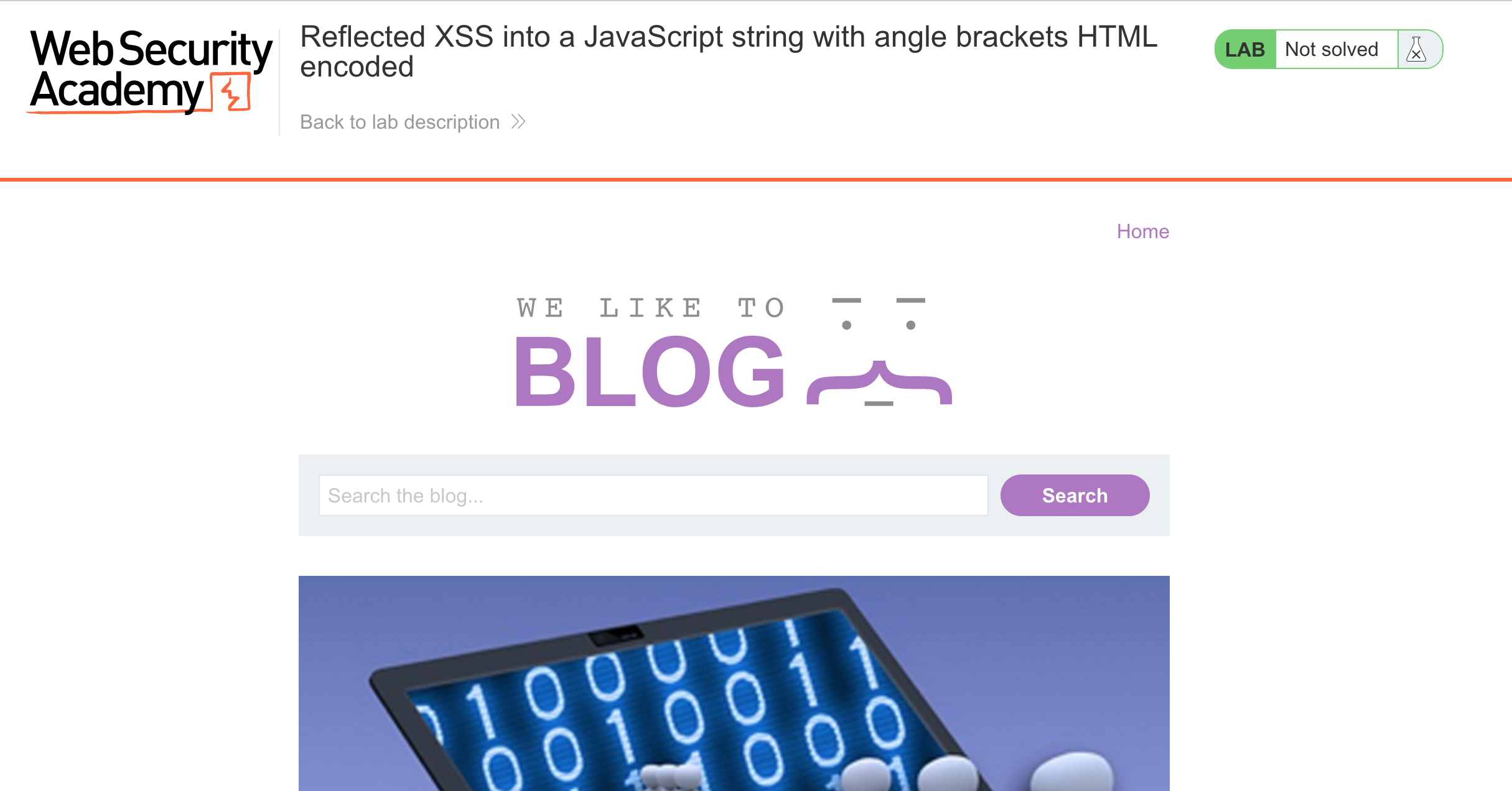 After logging in, head over to the lab, located at https://portswigger.net/web-security/cross-site-scripting/contexts/lab-javascript-string-angle-brackets-html-encoded. You can find this through the Academy learning path list, or linked within the Reflected XSS blog post.