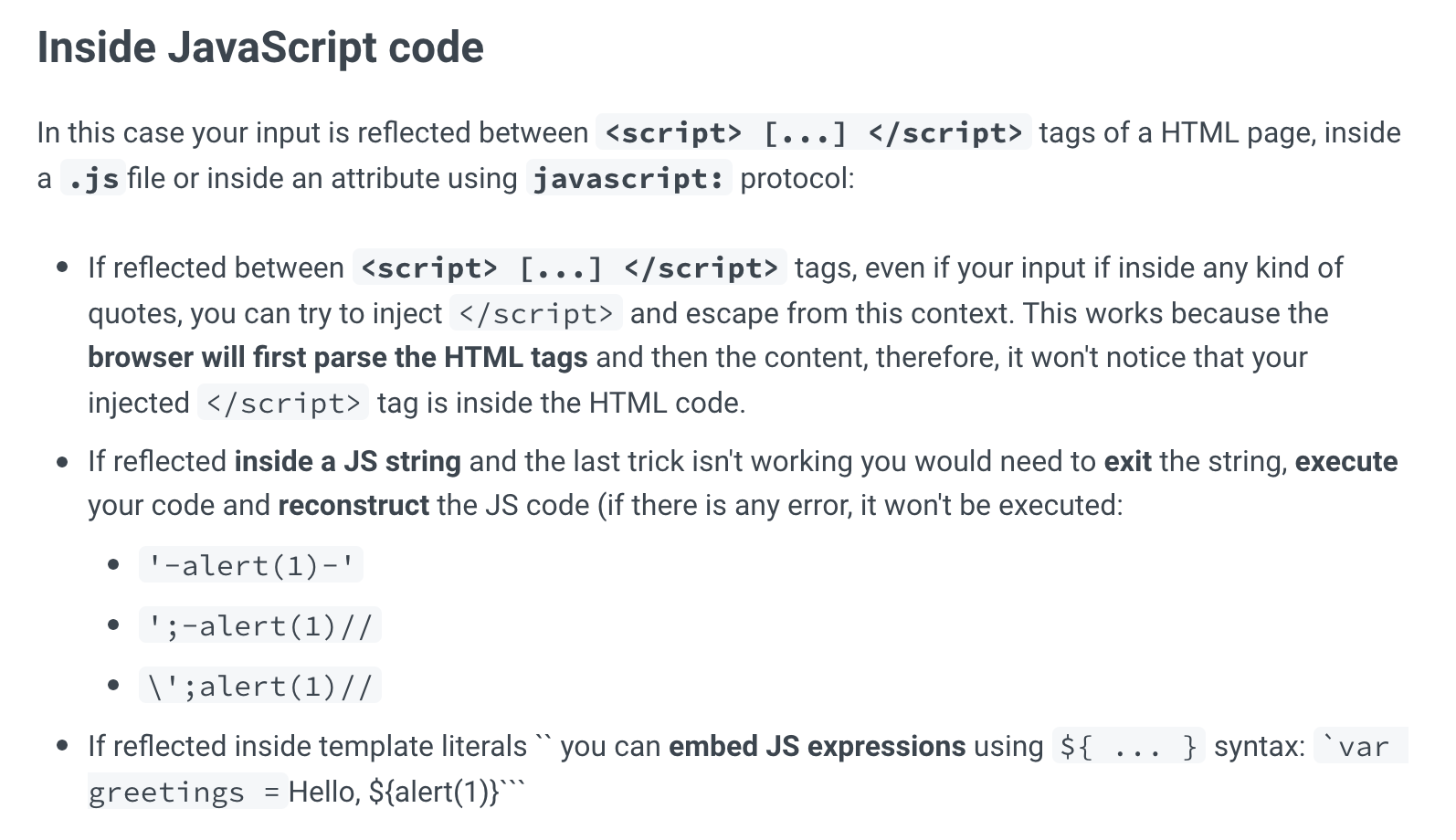 Using Hack Trick’s XSS post as a reference, the “Inside Javascript code” section has these options for XSS within Javascript: