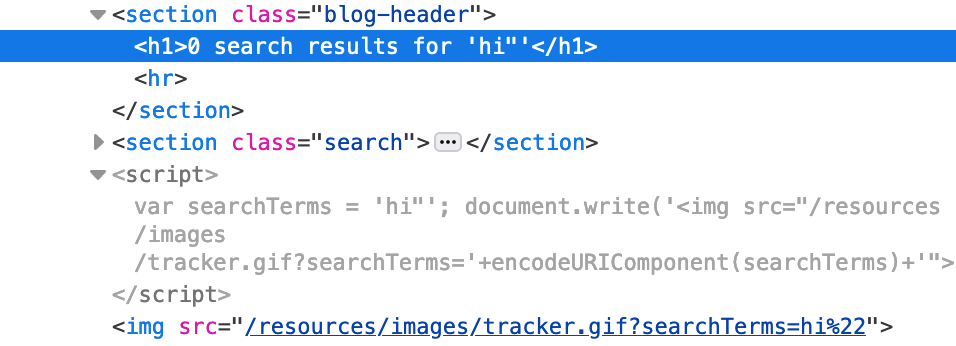 If we use a payload of hi", the resulting HTML and <script> output is as shown: